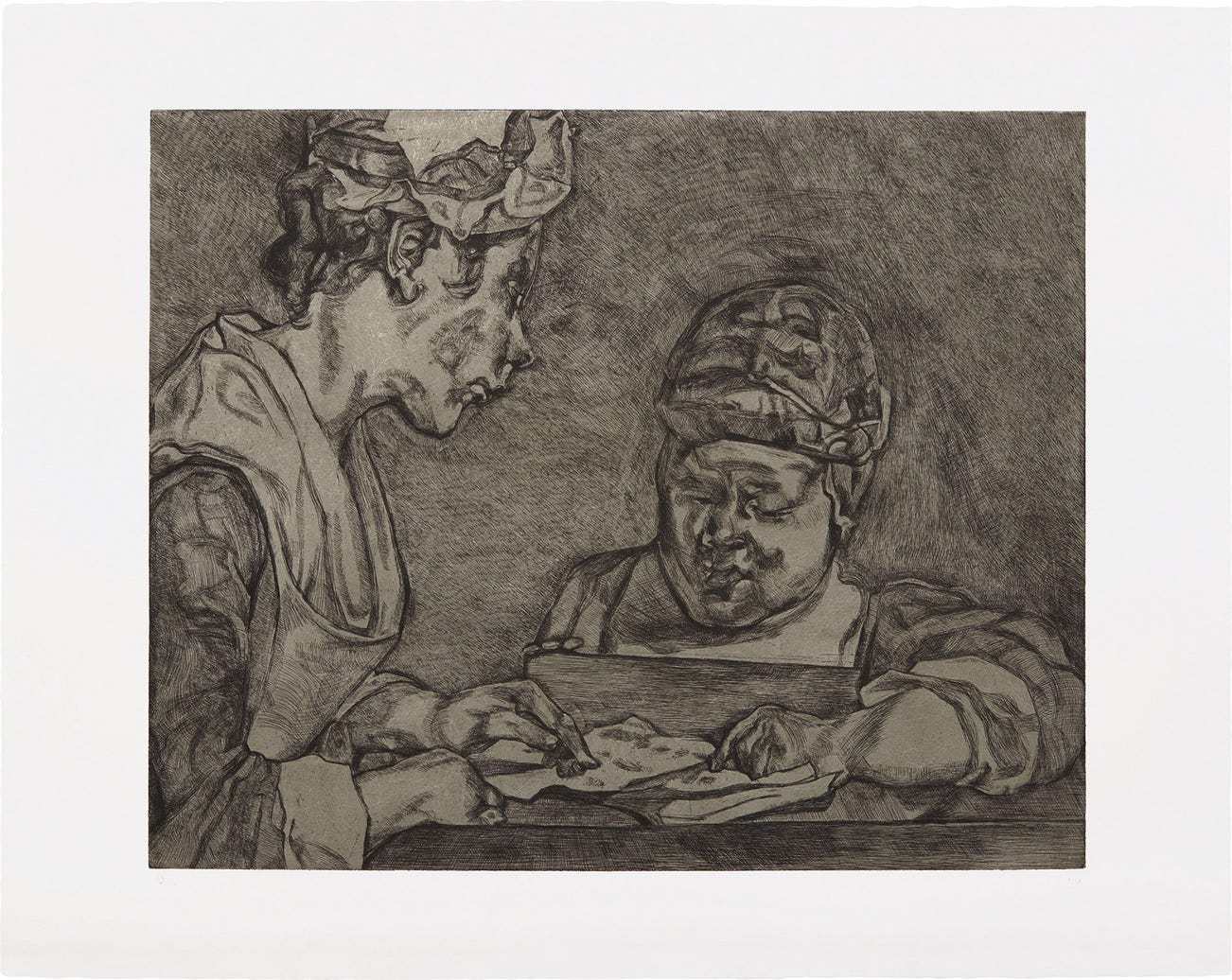 In his paintings, Freud's layers of impasto jabs of paint create a surprisingly delicate, translucent depiction of flesh, while his etchings employ an economy of line that implies the figure more than it illustrates it. Charismatic but irascible, Freud worked only from sitters that he knew, consistently focusing on translating his direct perceptions. The resulting portraits are redolent with a stark and evocative psychological intensity, underpinned by an unexpected tenderness towards the subject.