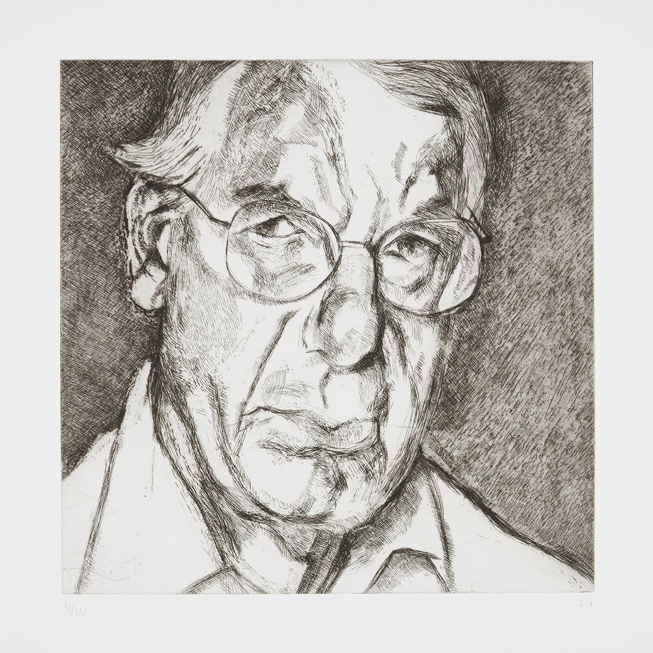 In his paintings, Freud's layers of impasto jabs of paint create a surprisingly delicate, translucent depiction of flesh, while his etchings employ an economy of line that implies the figure more than it illustrates it. Charismatic but irascible, Freud worked only from sitters that he knew, consistently focusing on translating his direct perceptions. The resulting portraits are redolent with a stark and evocative psychological intensity, underpinned by an unexpected tenderness towards the subject.