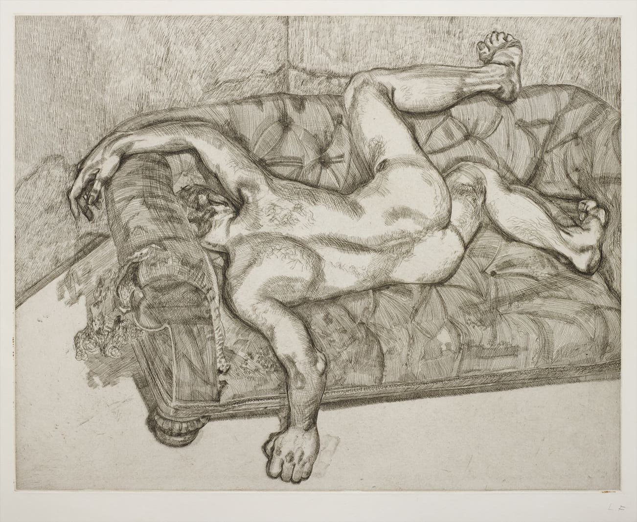 In his paintings, Freud's layers of impasto jabs of paint create a surprisingly delicate, translucent depiction of flesh, while his etchings employ an economy of line that implies the figure more than it illustrates it. Charismatic but irascible, Freud worked only from sitters that he knew, consistently focusing on translating his direct perceptions. The resulting portraits are redolent with a stark and evocative psychological intensity, underpinned by an unexpected tenderness towards the subject.