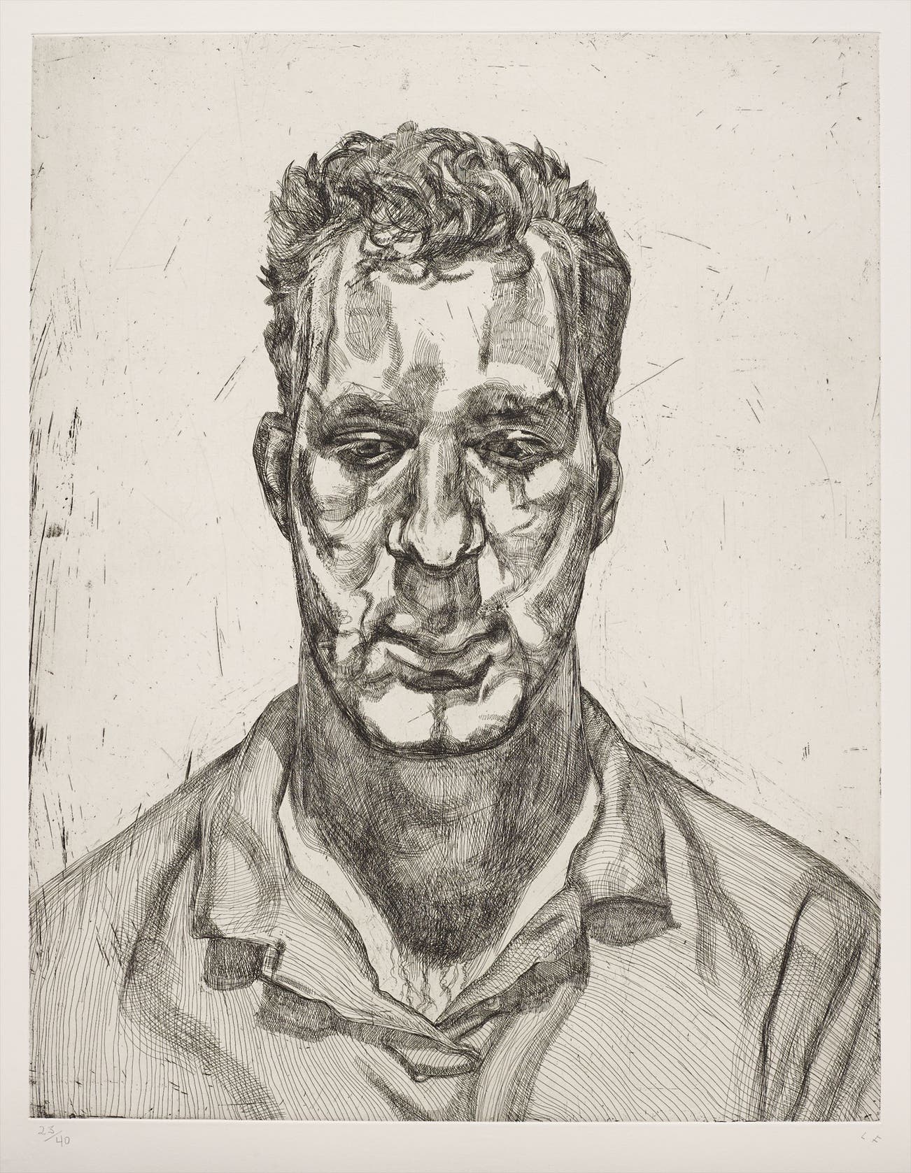 In his paintings, Freud's layers of impasto jabs of paint create a surprisingly delicate, translucent depiction of flesh, while his etchings employ an economy of line that implies the figure more than it illustrates it. Charismatic but irascible, Freud worked only from sitters that he knew, consistently focusing on translating his direct perceptions. The resulting portraits are redolent with a stark and evocative psychological intensity, underpinned by an unexpected tenderness towards the subject.