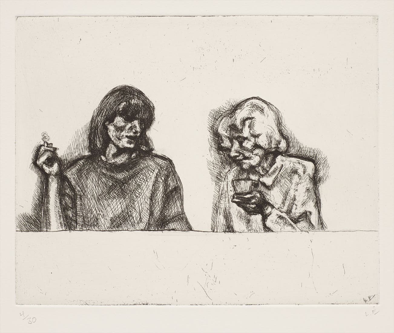 In his paintings, Freud's layers of impasto jabs of paint create a surprisingly delicate, translucent depiction of flesh, while his etchings employ an economy of line that implies the figure more than it illustrates it. Charismatic but irascible, Freud worked only from sitters that he knew, consistently focusing on translating his direct perceptions. The resulting portraits are redolent with a stark and evocative psychological intensity, underpinned by an unexpected tenderness towards the subject.