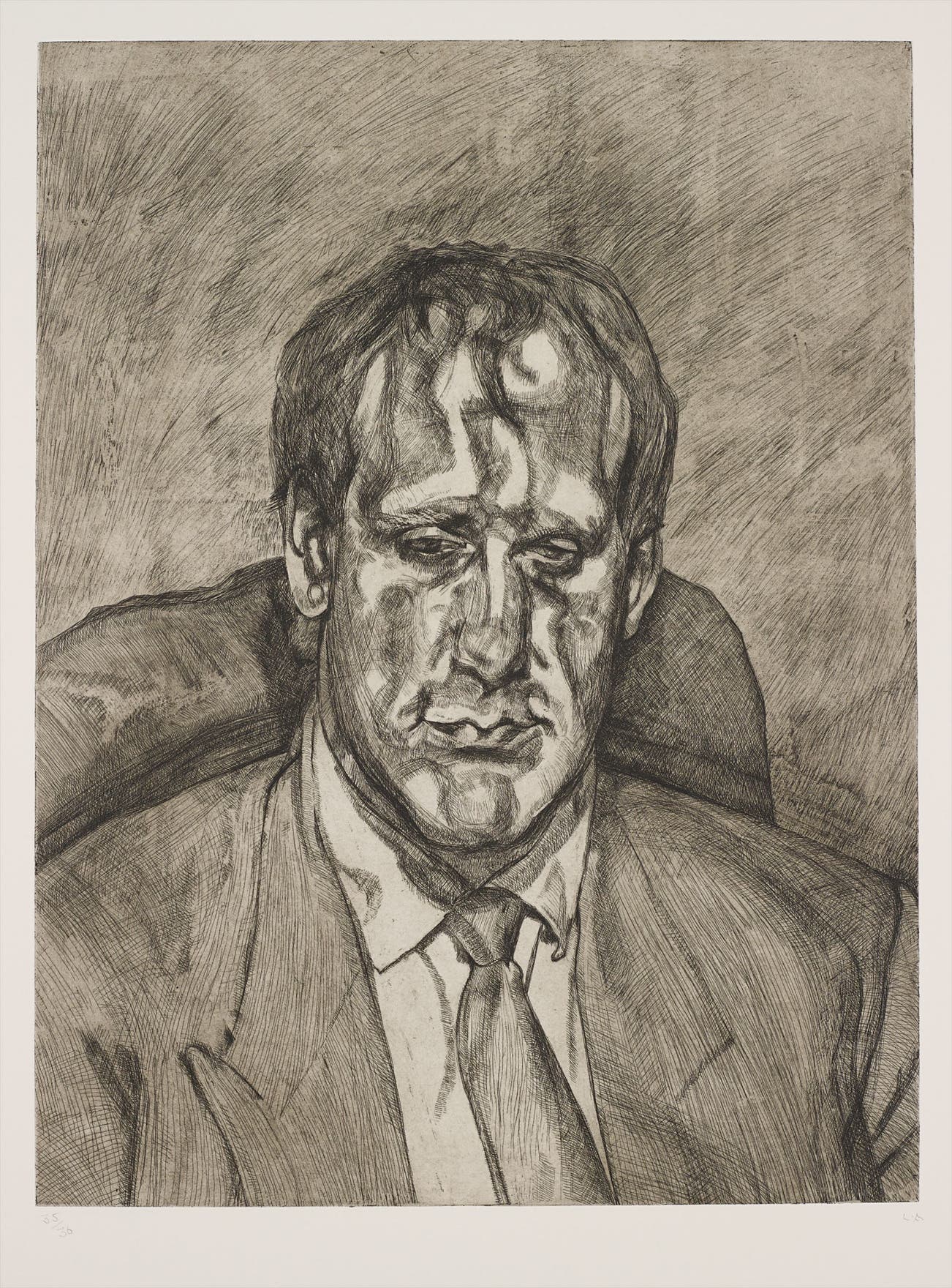 In his paintings, Freud's layers of impasto jabs of paint create a surprisingly delicate, translucent depiction of flesh, while his etchings employ an economy of line that implies the figure more than it illustrates it. Charismatic but irascible, Freud worked only from sitters that he knew, consistently focusing on translating his direct perceptions. The resulting portraits are redolent with a stark and evocative psychological intensity, underpinned by an unexpected tenderness towards the subject.