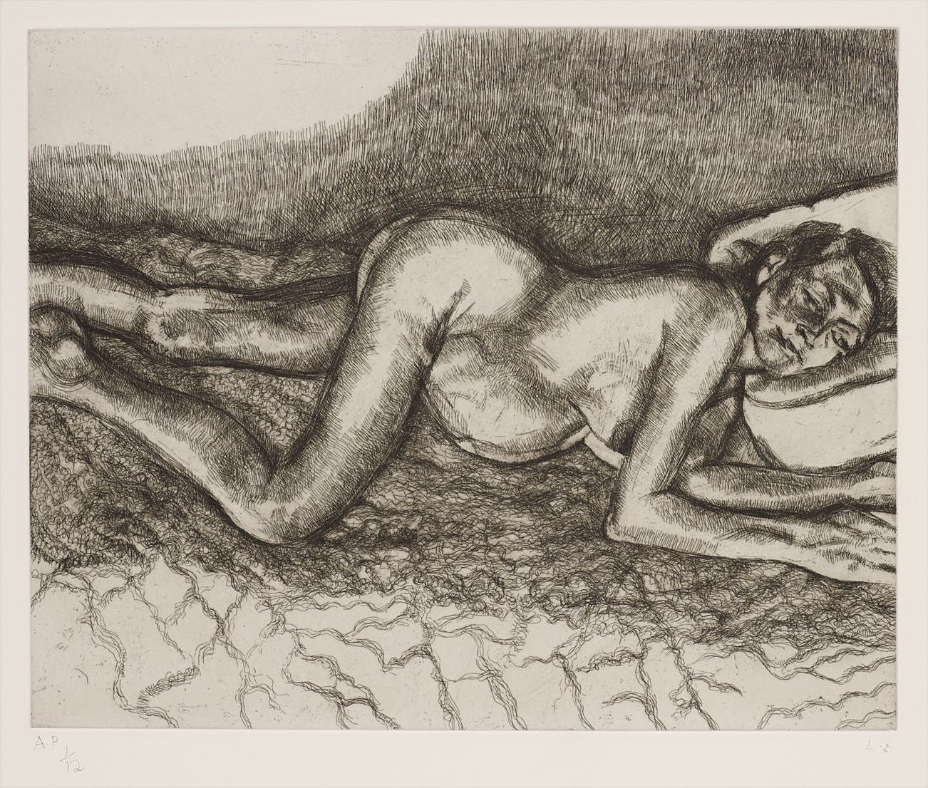 In his paintings, Freud's layers of impasto jabs of paint create a surprisingly delicate, translucent depiction of flesh, while his etchings employ an economy of line that implies the figure more than it illustrates it. Charismatic but irascible, Freud worked only from sitters that he knew, consistently focusing on translating his direct perceptions. The resulting portraits are redolent with a stark and evocative psychological intensity, underpinned by an unexpected tenderness towards the subject.