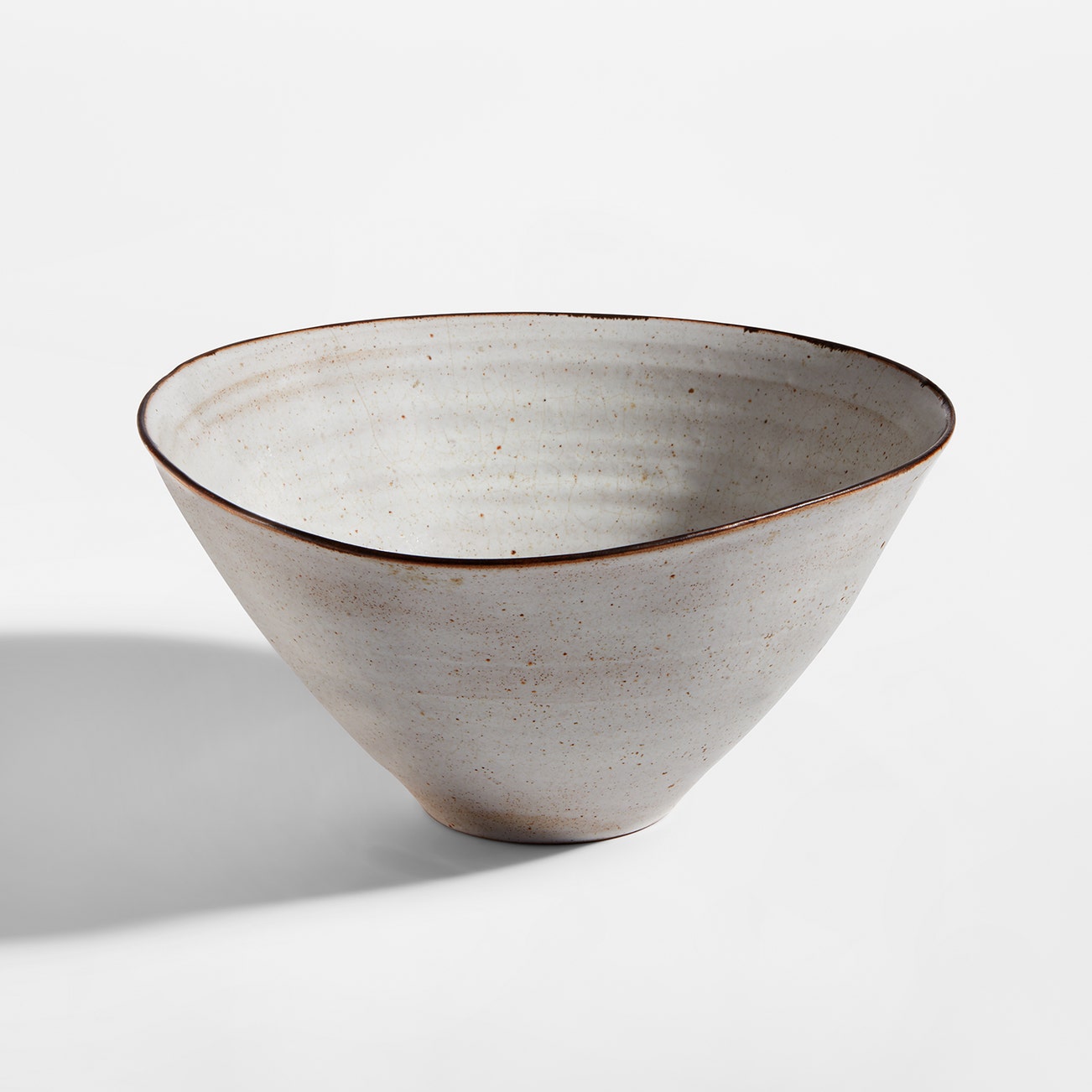 Stoneware with manganese speckle, white glaze with manganese rim.