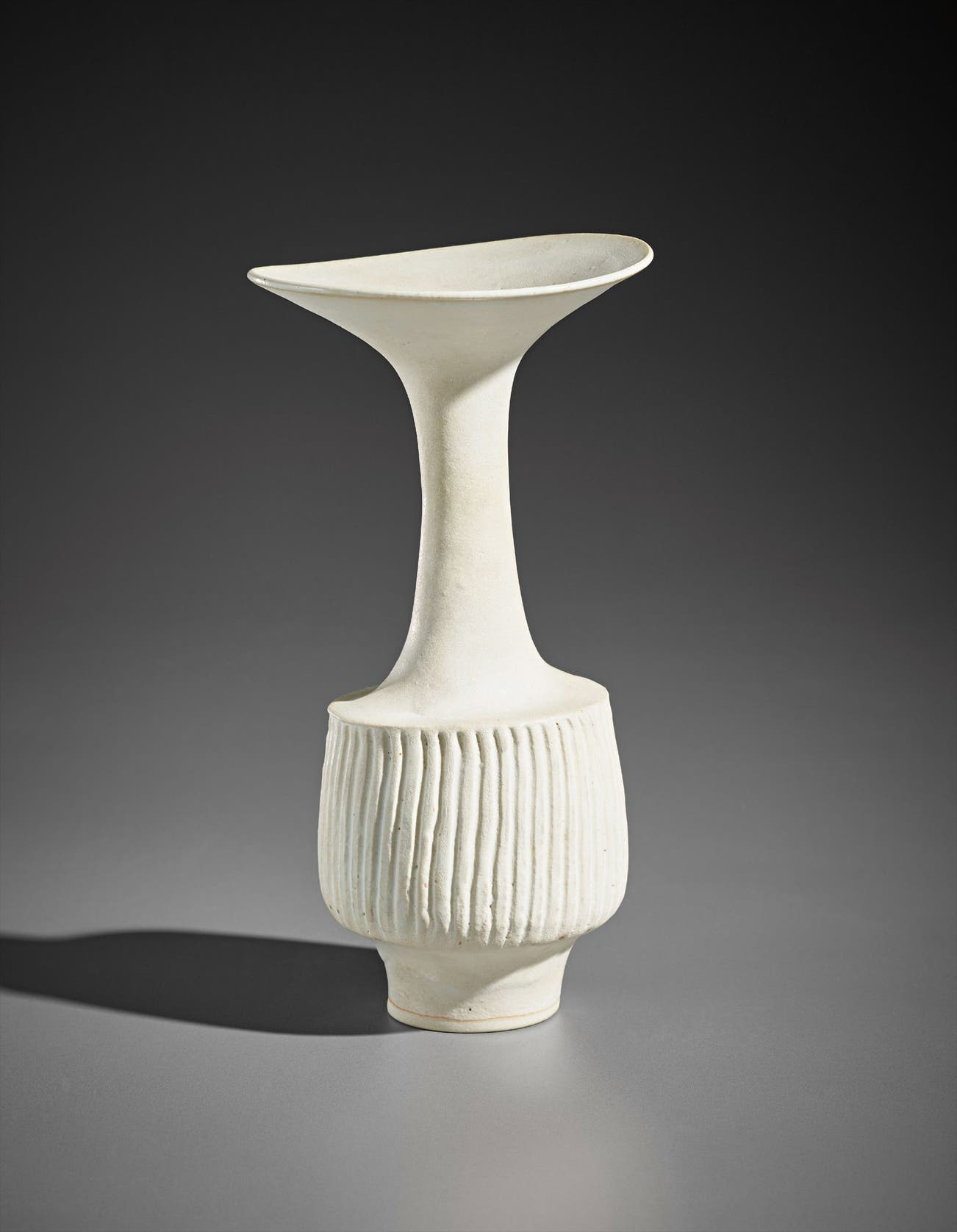 Austrian | B. 1902 D. 1995Dame Lucie Rie studied under Michael Powolny at the Kunstgewerbeschule in Vienna before immigrating to London in 1938. In London she started out making buttons for the fashion industry before producing austere, sparsely decorated tableware that caught the attention of modernist interior decorators. Eventually she hit her stride with the pitch-perfect footed bowls and flared vases for which she is best-known today. She worked in porcelain and stoneware, applying glaze directly to the unfired body and firing only once. She limited decoration to incised lines, subtle spirals and golden manganese lips, allowing the beauty of her thin-walled vessels to shine through. In contrast with the rustic pots of English ceramicist Bernard Leach, who is considered an heir to the Arts and Crafts movement, collectors and scholars revere Rie for creating pottery that was in dialogue with the design and architecture of European Modernism.