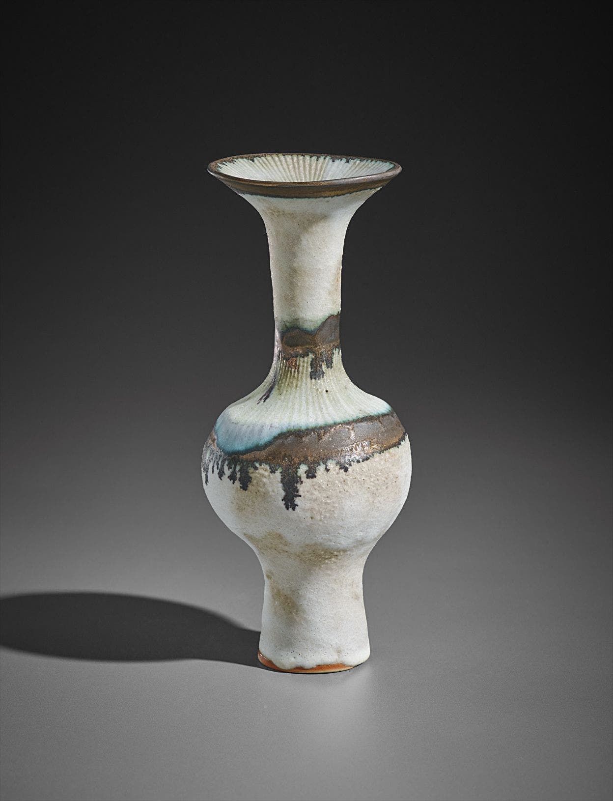 Austrian | B. 1902 D. 1995Dame Lucie Rie studied under Michael Powolny at the Kunstgewerbeschule in Vienna before immigrating to London in 1938. In London she started out making buttons for the fashion industry before producing austere, sparsely decorated tableware that caught the attention of modernist interior decorators. Eventually she hit her stride with the pitch-perfect footed bowls and flared vases for which she is best-known today. She worked in porcelain and stoneware, applying glaze directly to the unfired body and firing only once. She limited decoration to incised lines, subtle spirals and golden manganese lips, allowing the beauty of her thin-walled vessels to shine through. In contrast with the rustic pots of English ceramicist Bernard Leach, who is considered an heir to the Arts and Crafts movement, collectors and scholars revere Rie for creating pottery that was in dialogue with the design and architecture of European Modernism.