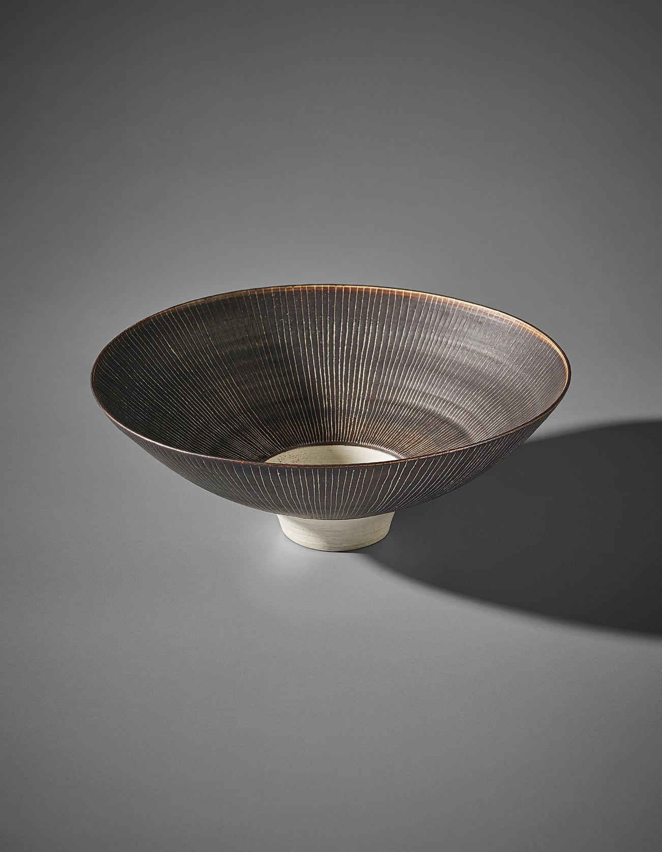 Austrian | B. 1902 D. 1995Dame Lucie Rie studied under Michael Powolny at the Kunstgewerbeschule in Vienna before immigrating to London in 1938. In London she started out making buttons for the fashion industry before producing austere, sparsely decorated tableware that caught the attention of modernist interior decorators. Eventually she hit her stride with the pitch-perfect footed bowls and flared vases for which she is best-known today. She worked in porcelain and stoneware, applying glaze directly to the unfired body and firing only once. She limited decoration to incised lines, subtle spirals and golden manganese lips, allowing the beauty of her thin-walled vessels to shine through. In contrast with the rustic pots of English ceramicist Bernard Leach, who is considered an heir to the Arts and Crafts movement, collectors and scholars revere Rie for creating pottery that was in dialogue with the design and architecture of European Modernism.