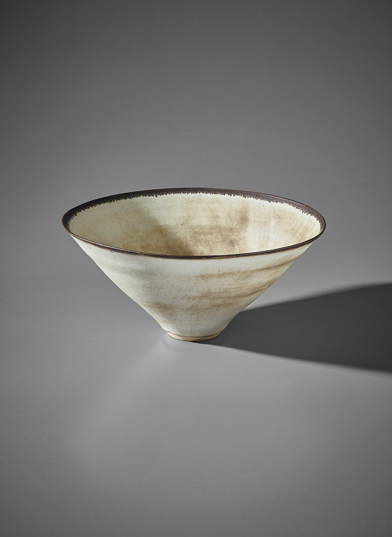 Austrian | B. 1902 D. 1995Dame Lucie Rie studied under Michael Powolny at the Kunstgewerbeschule in Vienna before immigrating to London in 1938. In London she started out making buttons for the fashion industry before producing austere, sparsely decorated tableware that caught the attention of modernist interior decorators. Eventually she hit her stride with the pitch-perfect footed bowls and flared vases for which she is best-known today. She worked in porcelain and stoneware, applying glaze directly to the unfired body and firing only once. She limited decoration to incised lines, subtle spirals and golden manganese lips, allowing the beauty of her thin-walled vessels to shine through. In contrast with the rustic pots of English ceramicist Bernard Leach, who is considered an heir to the Arts and Crafts movement, collectors and scholars revere Rie for creating pottery that was in dialogue with the design and architecture of European Modernism.