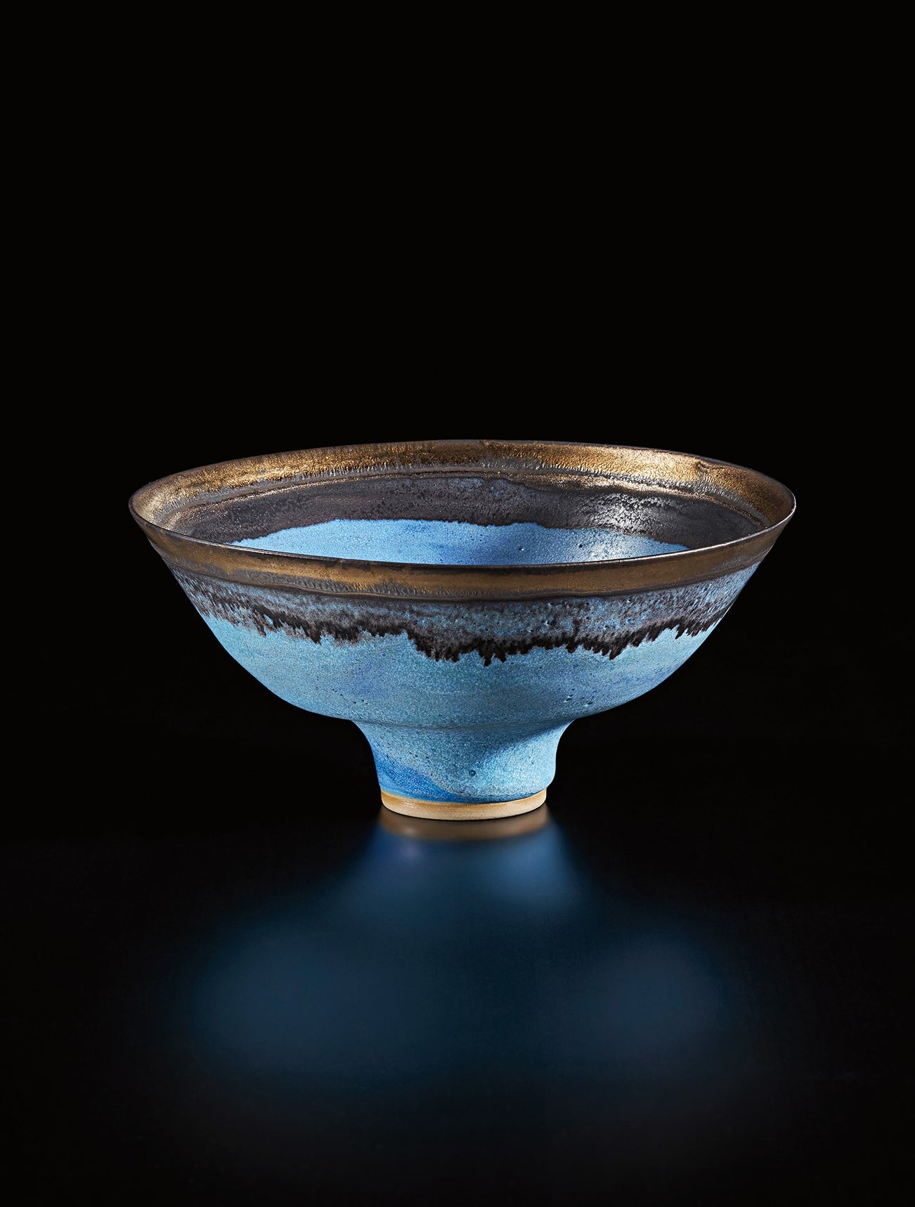 In the last two decades of her life Lucie Rie was able to consolidate her interest in colour, concentrating on some of the vivid glazes she was formulating in the 1950s and 60s; rich bronzes, brilliant yellows and pinks, greens, and luminous blues. As the critic and curator Margot Coatts wrote of her later work, she was dealing more in 'abstract elements', focusing on and refining her most characteristic forms, and ones which could have a considerable sculptural presence. They also revealed a potter able to enjoy herself on more expansive pieces, and this bowl from 1985 (first exhibited at Fischer Fine Art) shows Rie at her richest and most elemental. Generously flared, with a typically deep foot, she used a smooth luminous blue frosted glaze on both interior and exterior, and with a manganese / copper bronze band around the rim, this generously bleeding into the base glaze like a rain cloud washing into a blue sky. Such objects express the fundamentals of the potter’s art; containment, volume and space, and the 'latent energy' (as the potter Joanna Constantinidis called it) of something having risen organically, expanding on the wheel. As the critic Herbert Read wrote in 1931, 'Pottery is pure art; it is art freed from any imitative intention. Sculpture, to which it is most nearly related, had from the first an imitative intention, and is perhaps to that extent less free for the expression of the will to form than pottery; pottery is plastic art in its most abstract essence'. This bowl epitomises this quality of pure abstraction.