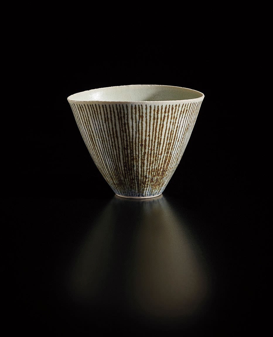 Austrian | B. 1902 D. 1995Dame Lucie Rie studied under Michael Powolny at the Kunstgewerbeschule in Vienna before immigrating to London in 1938. In London she started out making buttons for the fashion industry before producing austere, sparsely decorated tableware that caught the attention of modernist interior decorators. Eventually she hit her stride with the pitch-perfect footed bowls and flared vases for which she is best-known today. She worked in porcelain and stoneware, applying glaze directly to the unfired body and firing only once. She limited decoration to incised lines, subtle spirals and golden manganese lips, allowing the beauty of her thin-walled vessels to shine through. In contrast with the rustic pots of English ceramicist Bernard Leach, who is considered an heir to the Arts and Crafts movement, collectors and scholars revere Rie for creating pottery that was in dialogue with the design and architecture of European Modernism.
