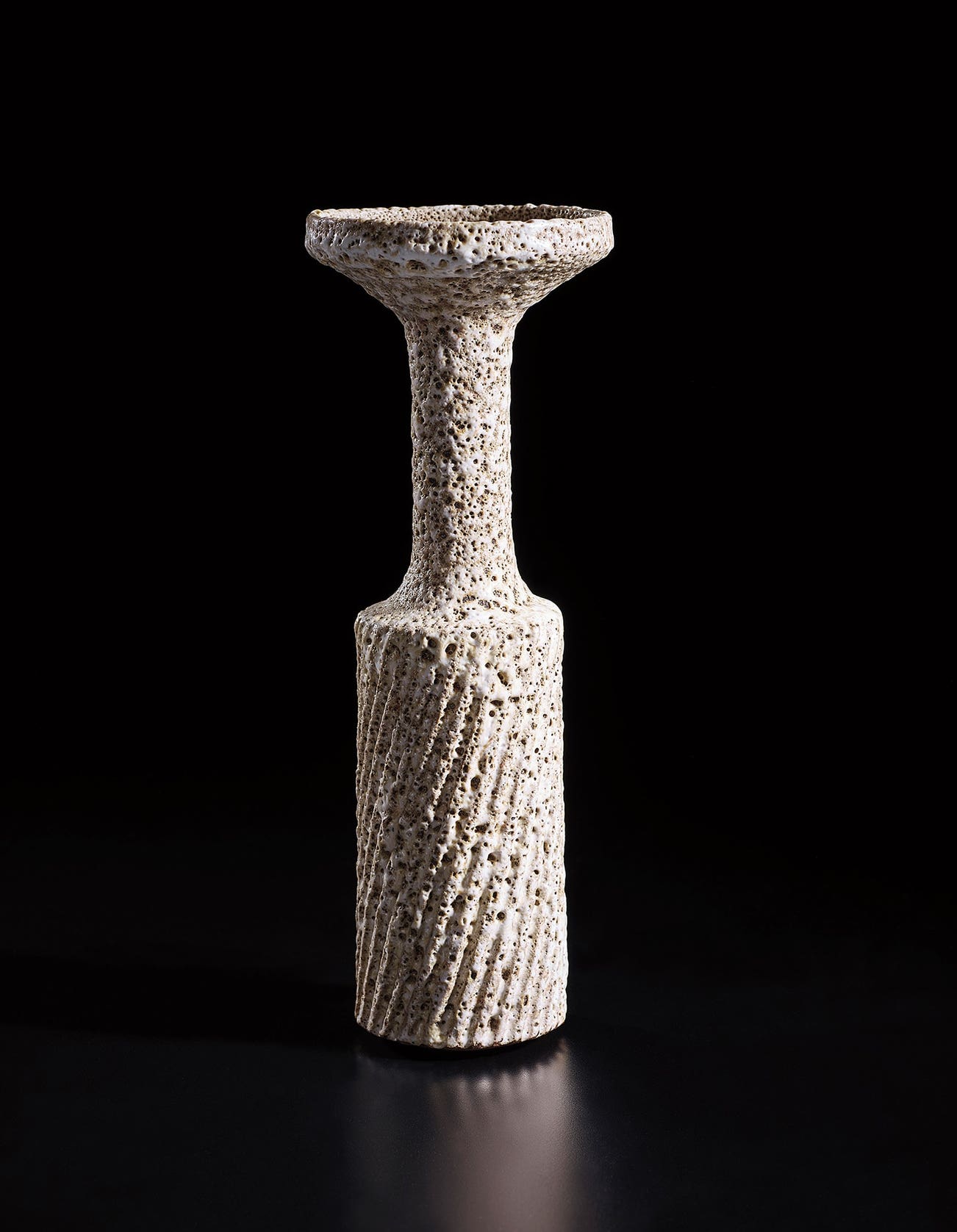 For Rie, Ohly’s outlook must surely have underlined her interest in the economy of early pots, one which suited her own modernist aesthetic formulated in Vienna. In around 1948, she made a trip to Avebury, where at the museum she was deeply impressed by the Neolithic and Bronze Age bowls and beakers. She was particularly intrigued by their incised decoration (and the improvised tools used to make them), which Rie developed into her characteristic sgraffito. The early Rie bowls from the Ohly collection illustrate her initial efforts with this technique, revealing her ability to use minimal repeated incising to enhance the shape and moving away from the familiar brush decoration used by many contemporary potters (lots 303, 304). Rie’s pared-down approach to her work reflected her Viennese-instilled absorption of modern architecture and design. In addition to individual pieces, Rie used sgraffito on much of her tableware, some of which she made with Coper. Notably, Rie developed her preference for linear decoration in some of her more heavily glazed and pitted pieces that she had made by the 1960s, for example the beautiful cylindrical vase in the Bienchen Ohly collection, here elaborated by diagonal fluting (lot 301). The flared vase in the collection is another example of Rie’s fresh and innovative sense of form; adopting a kind of stem-cup shape, Rie created a minimally conceived object made for a modern interior (lot 302).