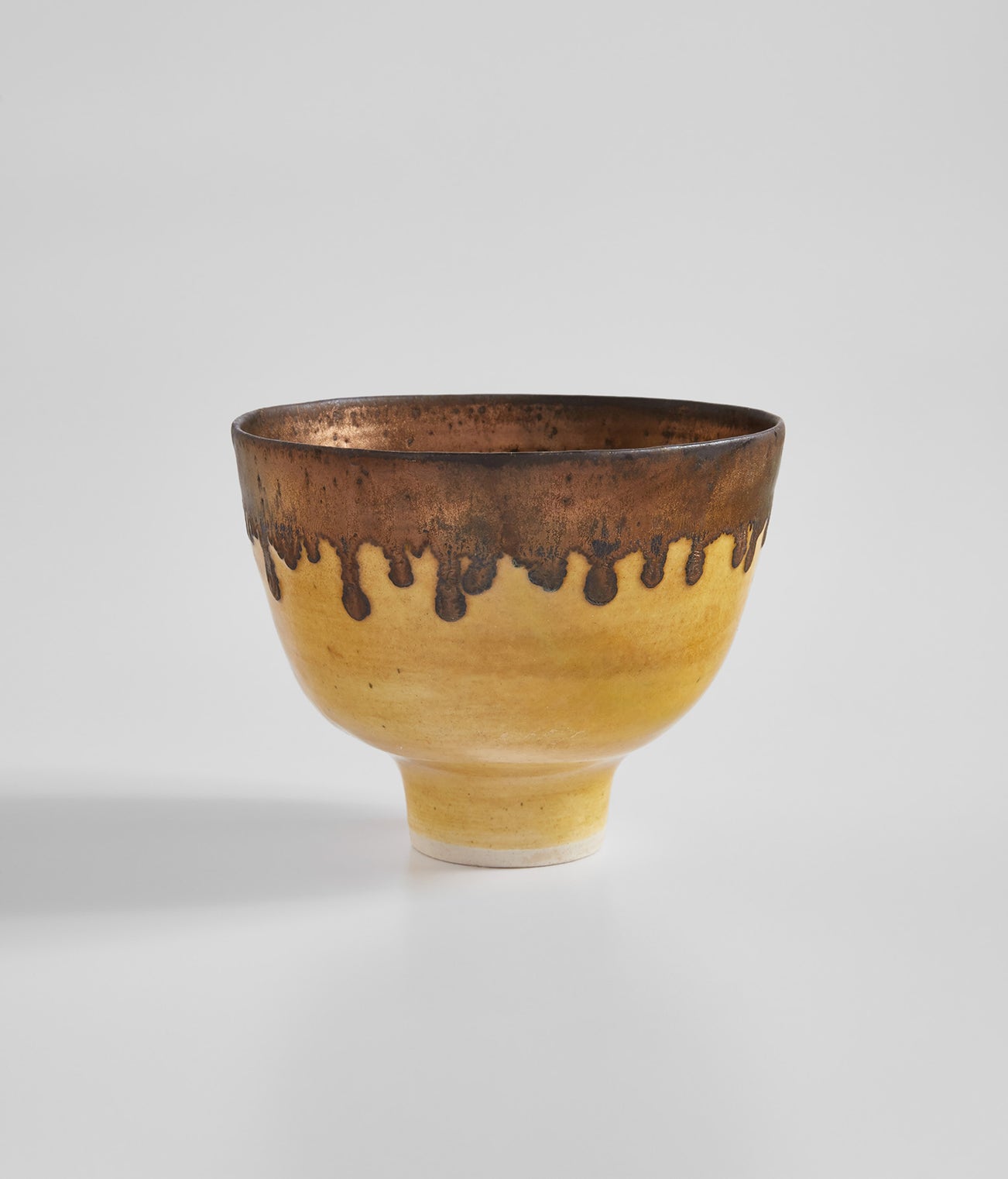 Austrian | B. 1902 D. 1995Dame Lucie Rie studied under Michael Powolny at the Kunstgewerbeschule in Vienna before immigrating to London in 1938. In London she started out making buttons for the fashion industry before producing austere, sparsely decorated tableware that caught the attention of modernist interior decorators. Eventually she hit her stride with the pitch-perfect footed bowls and flared vases for which she is best-known today. She worked in porcelain and stoneware, applying glaze directly to the unfired body and firing only once. She limited decoration to incised lines, subtle spirals and golden manganese lips, allowing the beauty of her thin-walled vessels to shine through. In contrast with the rustic pots of English ceramicist Bernard Leach, who is considered an heir to the Arts and Crafts movement, collectors and scholars revere Rie for creating pottery that was in dialogue with the design and architecture of European Modernism.