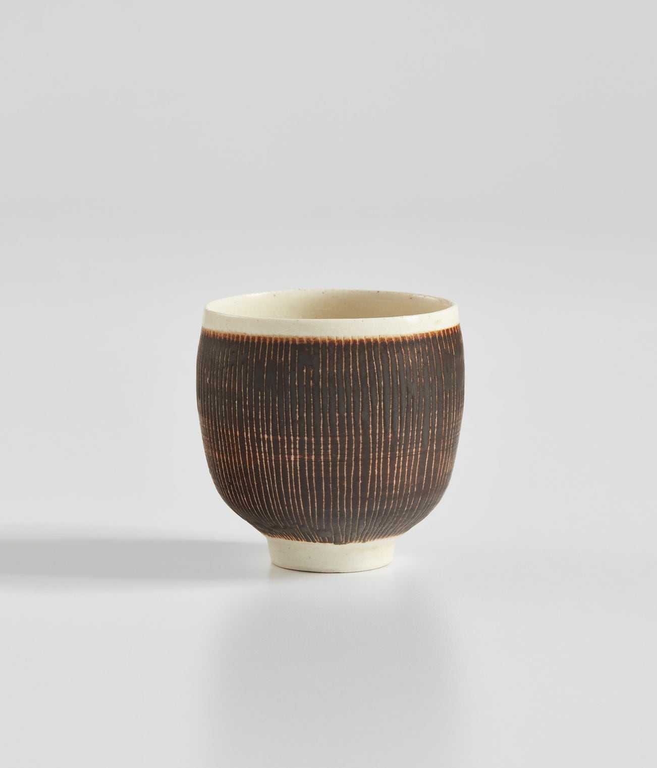 Austrian | B. 1902 D. 1995Dame Lucie Rie studied under Michael Powolny at the Kunstgewerbeschule in Vienna before immigrating to London in 1938. In London she started out making buttons for the fashion industry before producing austere, sparsely decorated tableware that caught the attention of modernist interior decorators. Eventually she hit her stride with the pitch-perfect footed bowls and flared vases for which she is best-known today. She worked in porcelain and stoneware, applying glaze directly to the unfired body and firing only once. She limited decoration to incised lines, subtle spirals and golden manganese lips, allowing the beauty of her thin-walled vessels to shine through. In contrast with the rustic pots of English ceramicist Bernard Leach, who is considered an heir to the Arts and Crafts movement, collectors and scholars revere Rie for creating pottery that was in dialogue with the design and architecture of European Modernism.