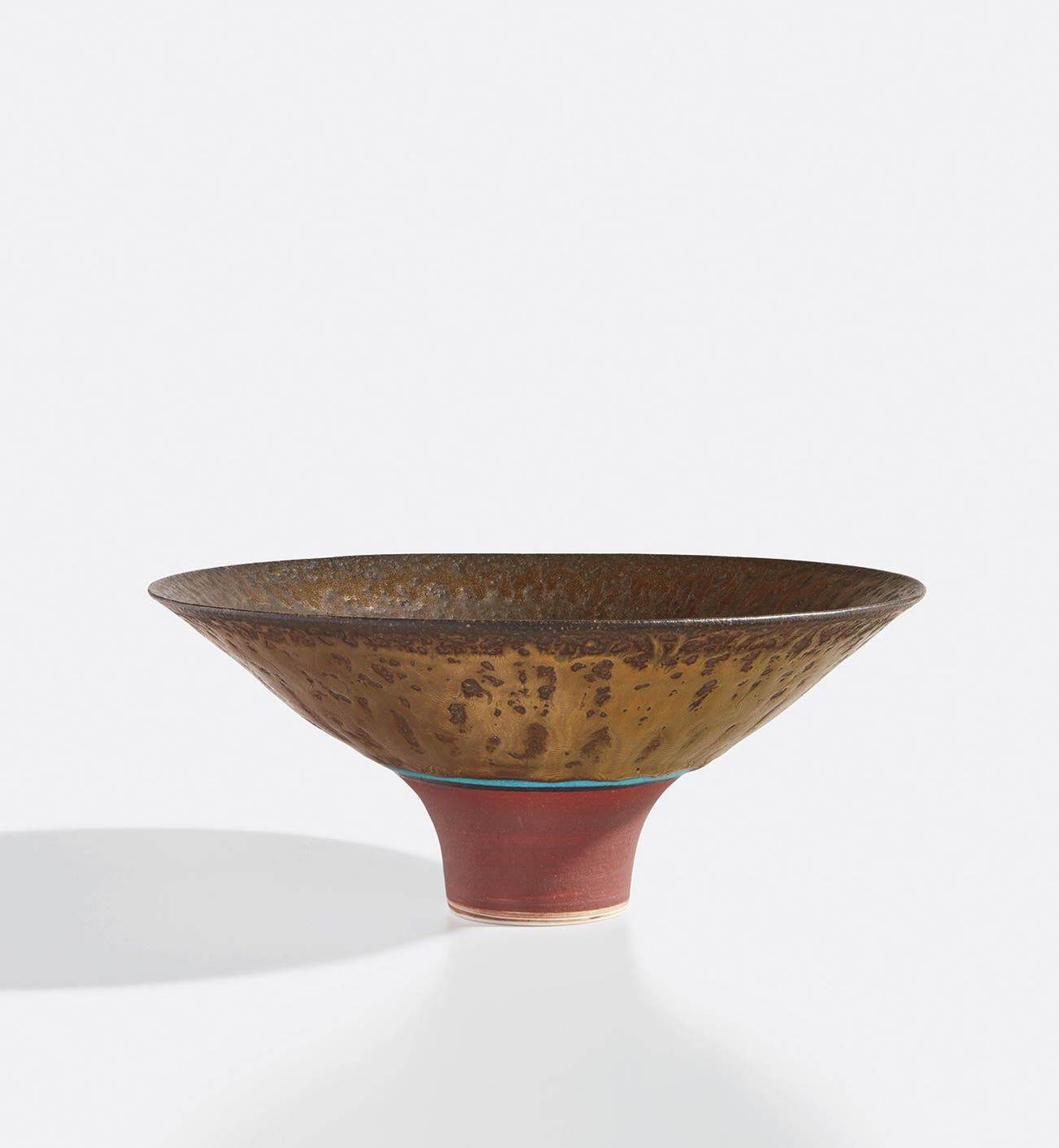Austrian | B. 1902 D. 1995Dame Lucie Rie studied under Michael Powolny at the Kunstgewerbeschule in Vienna before immigrating to London in 1938. In London she started out making buttons for the fashion industry before producing austere, sparsely decorated tableware that caught the attention of modernist interior decorators. Eventually she hit her stride with the pitch-perfect footed bowls and flared vases for which she is best-known today. She worked in porcelain and stoneware, applying glaze directly to the unfired body and firing only once. She limited decoration to incised lines, subtle spirals and golden manganese lips, allowing the beauty of her thin-walled vessels to shine through. In contrast with the rustic pots of English ceramicist Bernard Leach, who is considered an heir to the Arts and Crafts movement, collectors and scholars revere Rie for creating pottery that was in dialogue with the design and architecture of European Modernism.