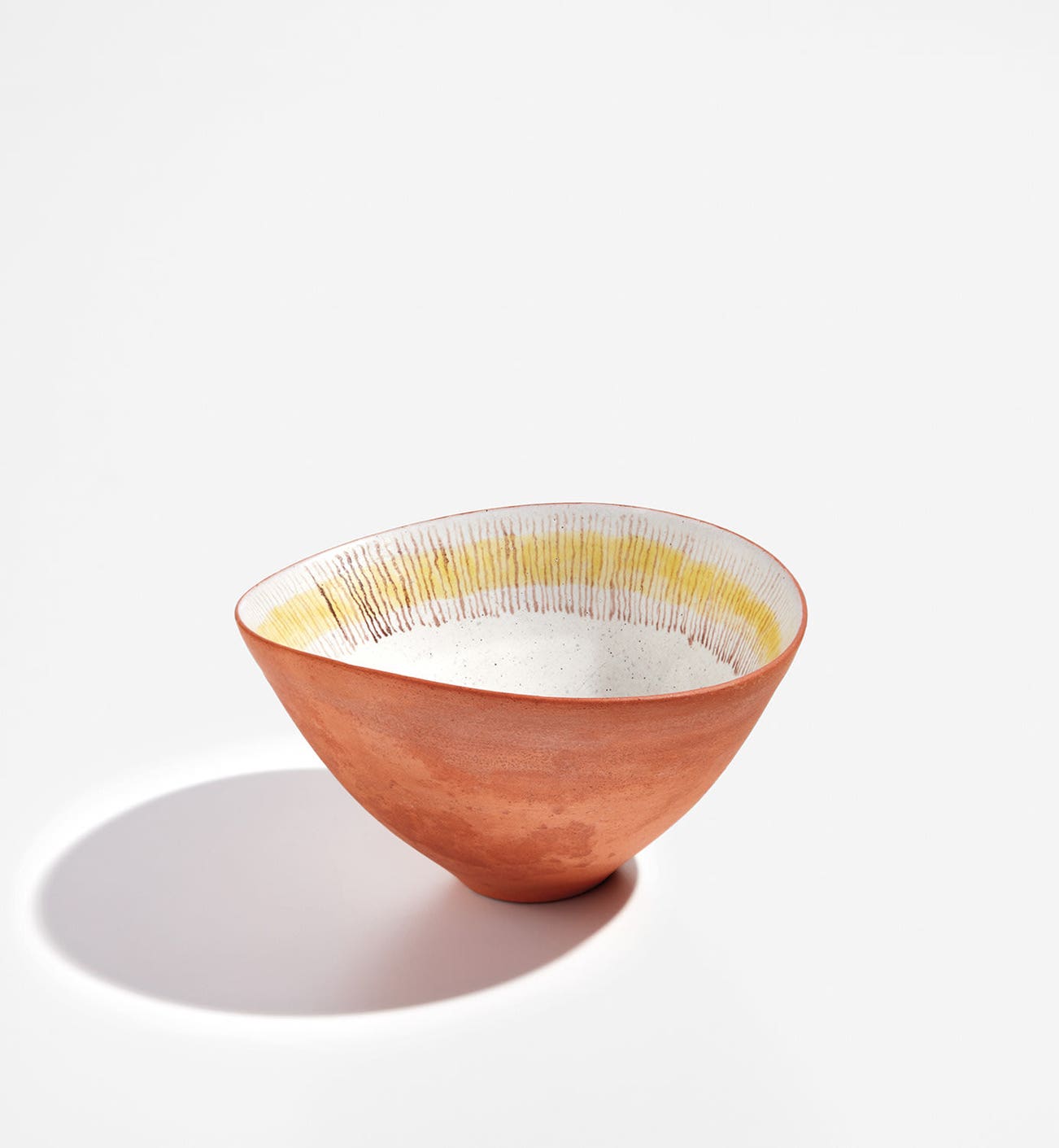 Austrian | B. 1902 D. 1995Dame Lucie Rie studied under Michael Powolny at the Kunstgewerbeschule in Vienna before immigrating to London in 1938. In London she started out making buttons for the fashion industry before producing austere, sparsely decorated tableware that caught the attention of modernist interior decorators. Eventually she hit her stride with the pitch-perfect footed bowls and flared vases for which she is best-known today. She worked in porcelain and stoneware, applying glaze directly to the unfired body and firing only once. She limited decoration to incised lines, subtle spirals and golden manganese lips, allowing the beauty of her thin-walled vessels to shine through. In contrast with the rustic pots of English ceramicist Bernard Leach, who is considered an heir to the Arts and Crafts movement, collectors and scholars revere Rie for creating pottery that was in dialogue with the design and architecture of European Modernism.