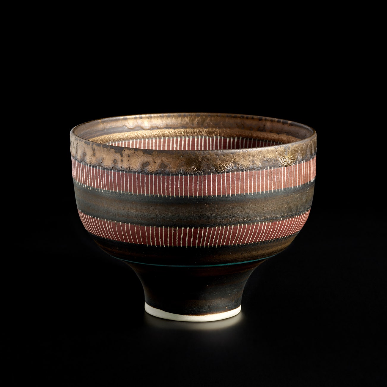 Austrian | B. 1902 D. 1995Dame Lucie Rie studied under Michael Powolny at the Kunstgewerbeschule in Vienna before immigrating to London in 1938. In London she started out making buttons for the fashion industry before producing austere, sparsely decorated tableware that caught the attention of modernist interior decorators. Eventually she hit her stride with the pitch-perfect footed bowls and flared vases for which she is best-known today. She worked in porcelain and stoneware, applying glaze directly to the unfired body and firing only once. She limited decoration to incised lines, subtle spirals and golden manganese lips, allowing the beauty of her thin-walled vessels to shine through. In contrast with the rustic pots of English ceramicist Bernard Leach, who is considered an heir to the Arts and Crafts movement, collectors and scholars revere Rie for creating pottery that was in dialogue with the design and architecture of European Modernism.