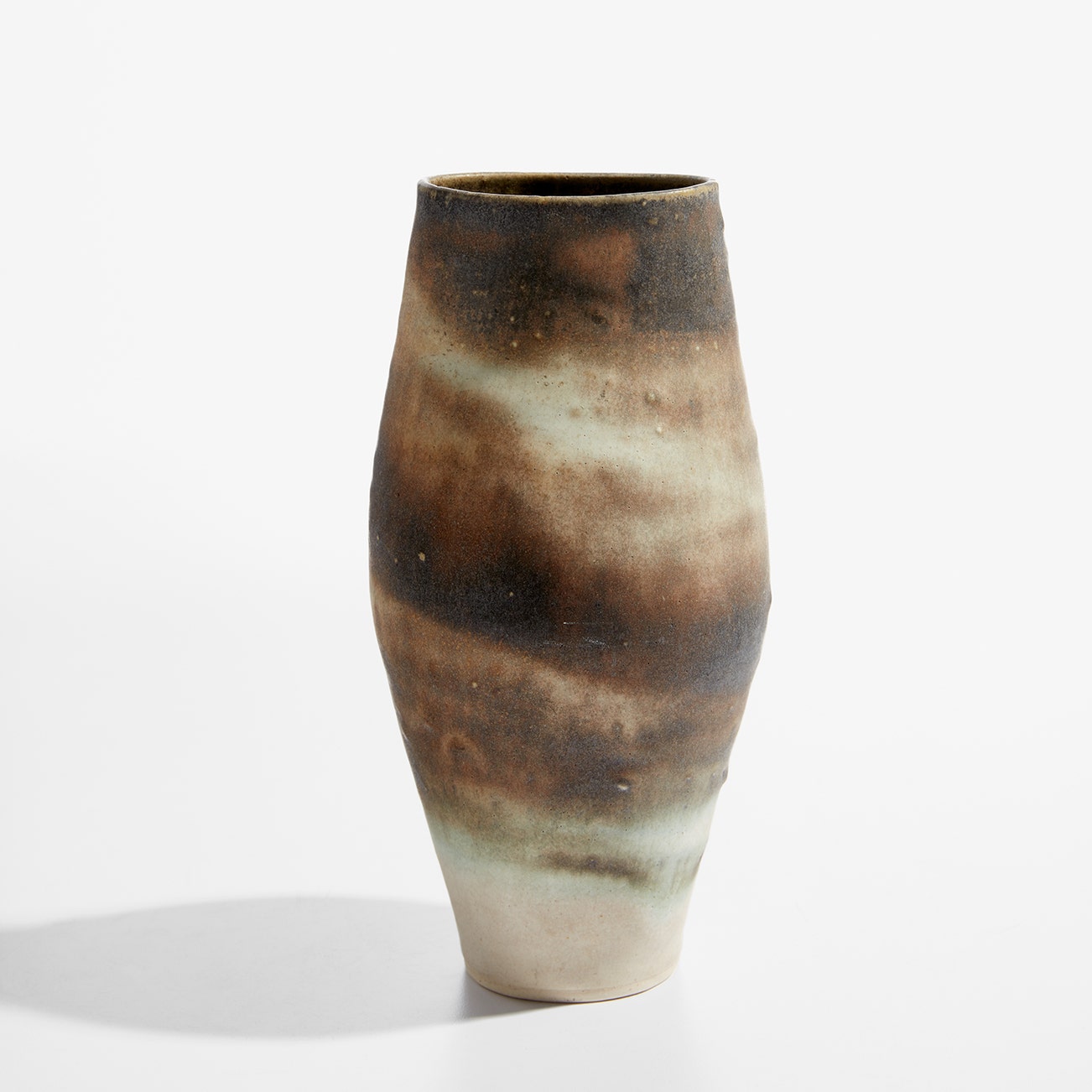 Austrian | B. 1902 D. 1995Dame Lucie Rie studied under Michael Powolny at the Kunstgewerbeschule in Vienna before immigrating to London in 1938. In London she started out making buttons for the fashion industry before producing austere, sparsely decorated tableware that caught the attention of modernist interior decorators. Eventually she hit her stride with the pitch-perfect footed bowls and flared vases for which she is best-known today. She worked in porcelain and stoneware, applying glaze directly to the unfired body and firing only once. She limited decoration to incised lines, subtle spirals and golden manganese lips, allowing the beauty of her thin-walled vessels to shine through. In contrast with the rustic pots of English ceramicist Bernard Leach, who is considered an heir to the Arts and Crafts movement, collectors and scholars revere Rie for creating pottery that was in dialogue with the design and architecture of European Modernism.