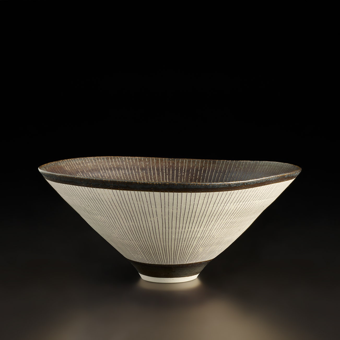 Austrian | B. 1902 D. 1995Dame Lucie Rie studied under Michael Powolny at the Kunstgewerbeschule in Vienna before immigrating to London in 1938. In London she started out making buttons for the fashion industry before producing austere, sparsely decorated tableware that caught the attention of modernist interior decorators. Eventually she hit her stride with the pitch-perfect footed bowls and flared vases for which she is best-known today. She worked in porcelain and stoneware, applying glaze directly to the unfired body and firing only once. She limited decoration to incised lines, subtle spirals and golden manganese lips, allowing the beauty of her thin-walled vessels to shine through. In contrast with the rustic pots of English ceramicist Bernard Leach, who is considered an heir to the Arts and Crafts movement, collectors and scholars revere Rie for creating pottery that was in dialogue with the design and architecture of European Modernism.