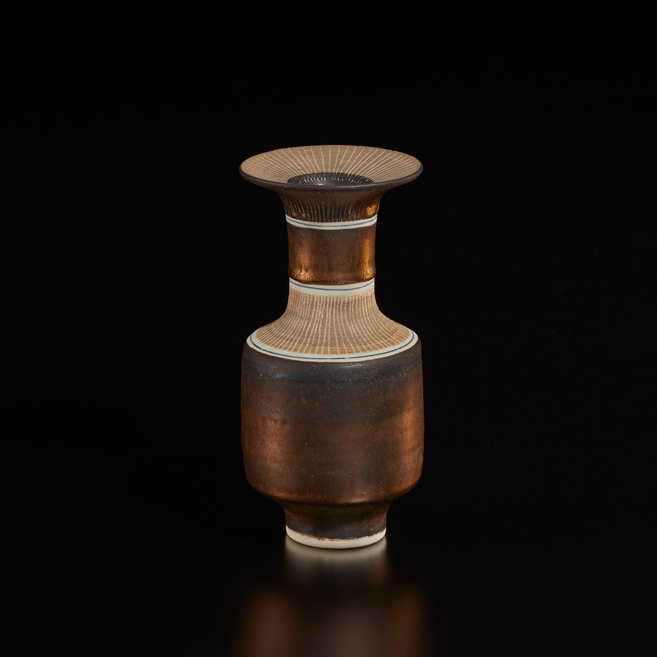 Austrian | B. 1902 D. 1995Dame Lucie Rie studied under Michael Powolny at the Kunstgewerbeschule in Vienna before immigrating to London in 1938. In London she started out making buttons for the fashion industry before producing austere, sparsely decorated tableware that caught the attention of modernist interior decorators. Eventually she hit her stride with the pitch-perfect footed bowls and flared vases for which she is best-known today. She worked in porcelain and stoneware, applying glaze directly to the unfired body and firing only once. She limited decoration to incised lines, subtle spirals and golden manganese lips, allowing the beauty of her thin-walled vessels to shine through. In contrast with the rustic pots of English ceramicist Bernard Leach, who is considered an heir to the Arts and Crafts movement, collectors and scholars revere Rie for creating pottery that was in dialogue with the design and architecture of European Modernism.
