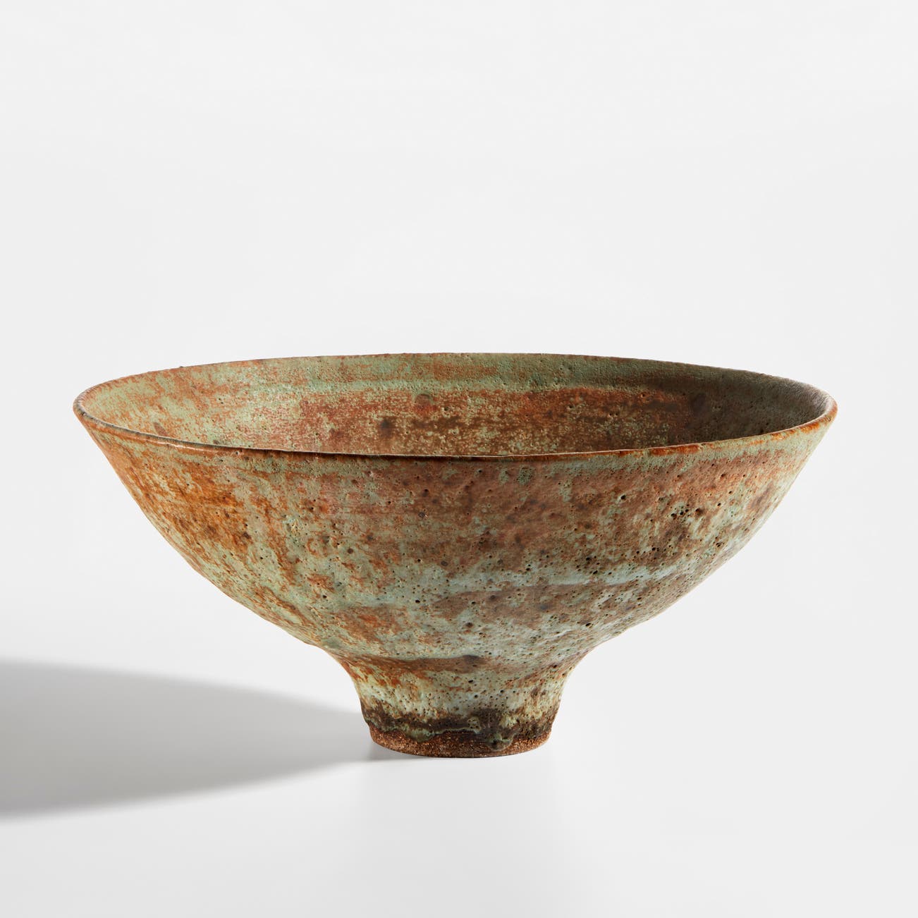 Austrian | B. 1902 D. 1995Dame Lucie Rie studied under Michael Powolny at the Kunstgewerbeschule in Vienna before immigrating to London in 1938. In London she started out making buttons for the fashion industry before producing austere, sparsely decorated tableware that caught the attention of modernist interior decorators. Eventually she hit her stride with the pitch-perfect footed bowls and flared vases for which she is best-known today. She worked in porcelain and stoneware, applying glaze directly to the unfired body and firing only once. She limited decoration to incised lines, subtle spirals and golden manganese lips, allowing the beauty of her thin-walled vessels to shine through. In contrast with the rustic pots of English ceramicist Bernard Leach, who is considered an heir to the Arts and Crafts movement, collectors and scholars revere Rie for creating pottery that was in dialogue with the design and architecture of European Modernism.