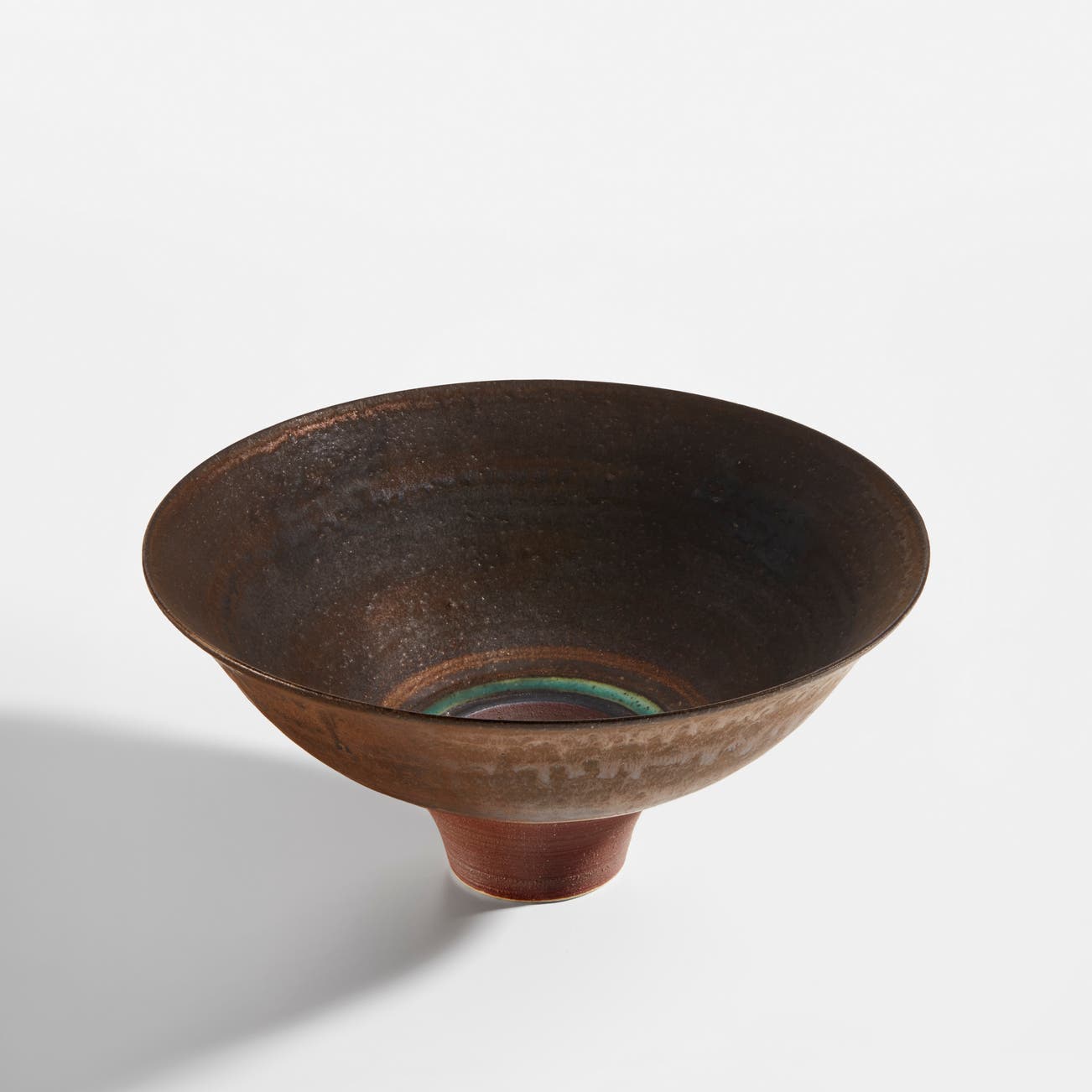 Austrian | B. 1902 D. 1995Dame Lucie Rie studied under Michael Powolny at the Kunstgewerbeschule in Vienna before immigrating to London in 1938. In London she started out making buttons for the fashion industry before producing austere, sparsely decorated tableware that caught the attention of modernist interior decorators. Eventually she hit her stride with the pitch-perfect footed bowls and flared vases for which she is best-known today. She worked in porcelain and stoneware, applying glaze directly to the unfired body and firing only once. She limited decoration to incised lines, subtle spirals and golden manganese lips, allowing the beauty of her thin-walled vessels to shine through. In contrast with the rustic pots of English ceramicist Bernard Leach, who is considered an heir to the Arts and Crafts movement, collectors and scholars revere Rie for creating pottery that was in dialogue with the design and architecture of European Modernism.