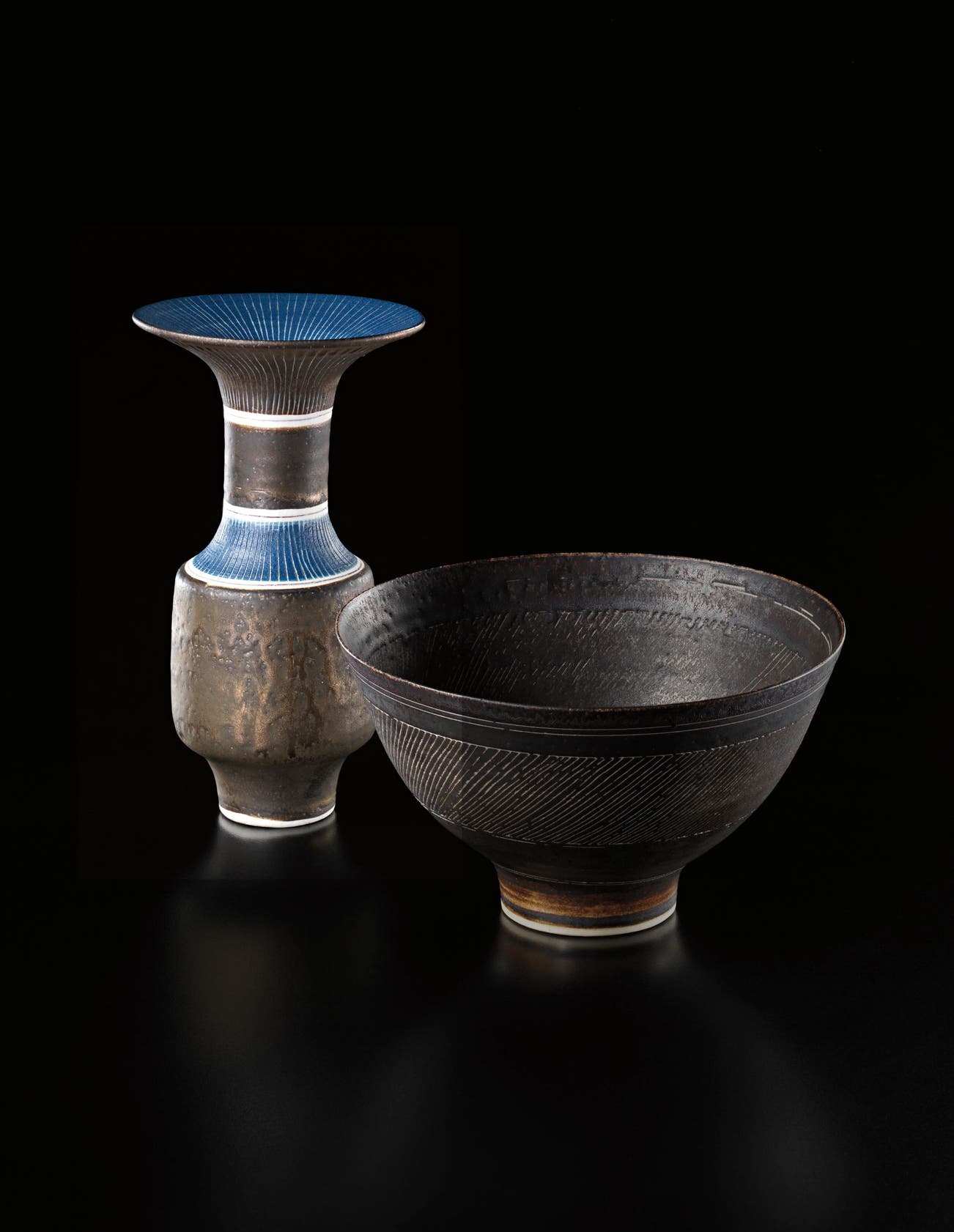 Austrian | B. 1902 D. 1995Dame Lucie Rie studied under Michael Powolny at the Kunstgewerbeschule in Vienna before immigrating to London in 1938. In London she started out making buttons for the fashion industry before producing austere, sparsely decorated tableware that caught the attention of modernist interior decorators. Eventually she hit her stride with the pitch-perfect footed bowls and flared vases for which she is best-known today. She worked in porcelain and stoneware, applying glaze directly to the unfired body and firing only once. She limited decoration to incised lines, subtle spirals and golden manganese lips, allowing the beauty of her thin-walled vessels to shine through. In contrast with the rustic pots of English ceramicist Bernard Leach, who is considered an heir to the Arts and Crafts movement, collectors and scholars revere Rie for creating pottery that was in dialogue with the design and architecture of European Modernism.