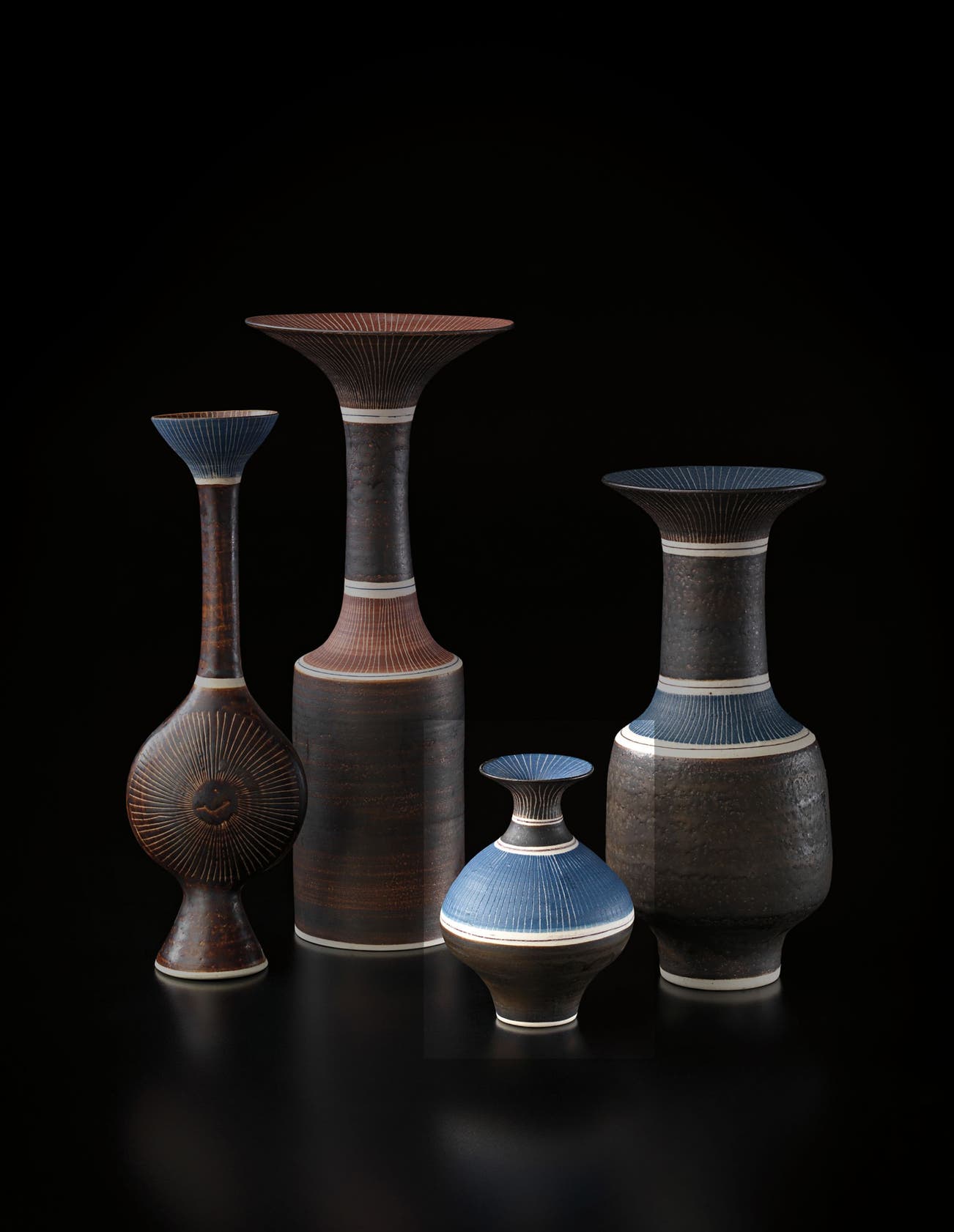 Austrian | B. 1902 D. 1995Dame Lucie Rie studied under Michael Powolny at the Kunstgewerbeschule in Vienna before immigrating to London in 1938. In London she started out making buttons for the fashion industry before producing austere, sparsely decorated tableware that caught the attention of modernist interior decorators. Eventually she hit her stride with the pitch-perfect footed bowls and flared vases for which she is best-known today. She worked in porcelain and stoneware, applying glaze directly to the unfired body and firing only once. She limited decoration to incised lines, subtle spirals and golden manganese lips, allowing the beauty of her thin-walled vessels to shine through. In contrast with the rustic pots of English ceramicist Bernard Leach, who is considered an heir to the Arts and Crafts movement, collectors and scholars revere Rie for creating pottery that was in dialogue with the design and architecture of European Modernism.