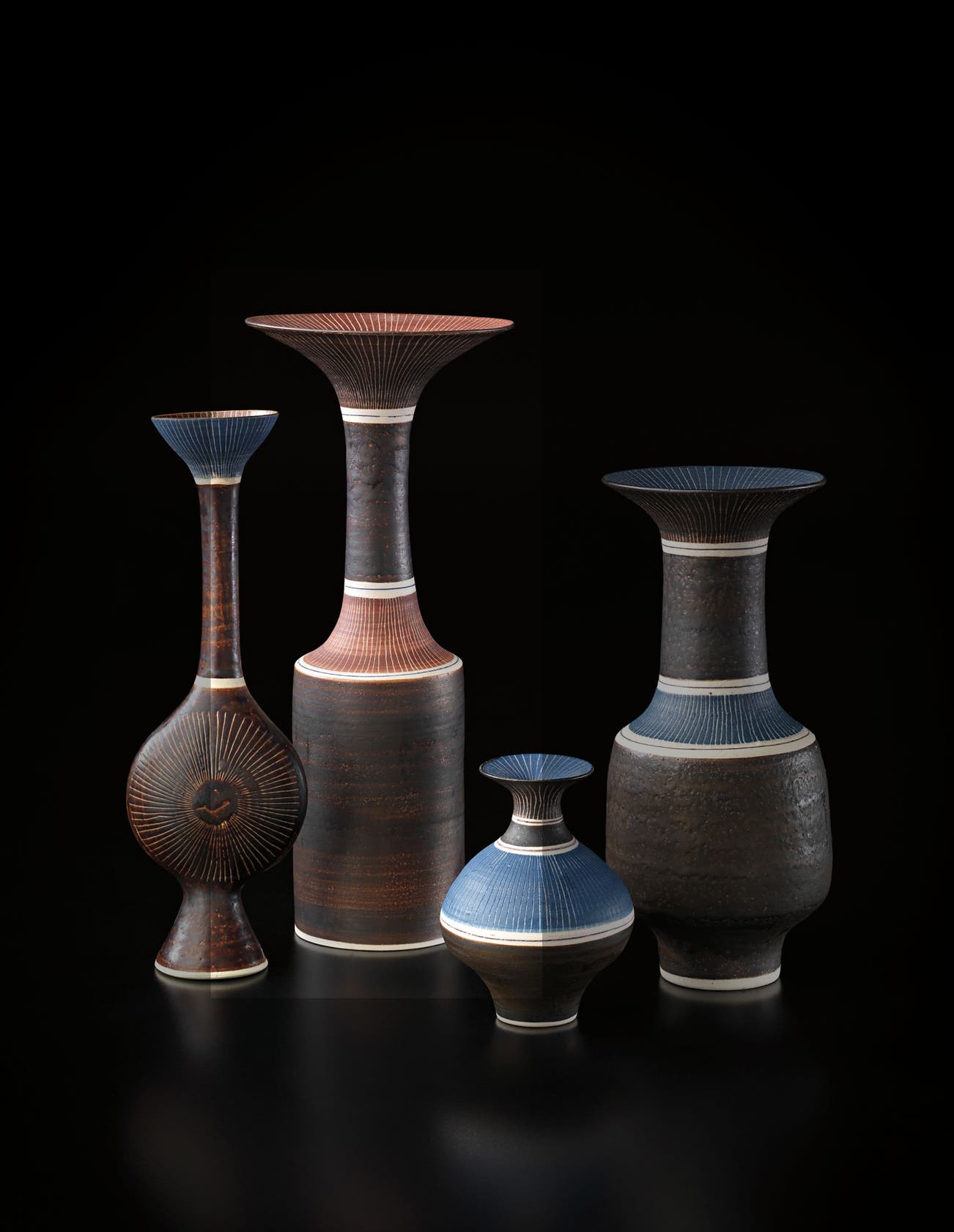 Austrian | B. 1902 D. 1995Dame Lucie Rie studied under Michael Powolny at the Kunstgewerbeschule in Vienna before immigrating to London in 1938. In London she started out making buttons for the fashion industry before producing austere, sparsely decorated tableware that caught the attention of modernist interior decorators. Eventually she hit her stride with the pitch-perfect footed bowls and flared vases for which she is best-known today. She worked in porcelain and stoneware, applying glaze directly to the unfired body and firing only once. She limited decoration to incised lines, subtle spirals and golden manganese lips, allowing the beauty of her thin-walled vessels to shine through. In contrast with the rustic pots of English ceramicist Bernard Leach, who is considered an heir to the Arts and Crafts movement, collectors and scholars revere Rie for creating pottery that was in dialogue with the design and architecture of European Modernism.