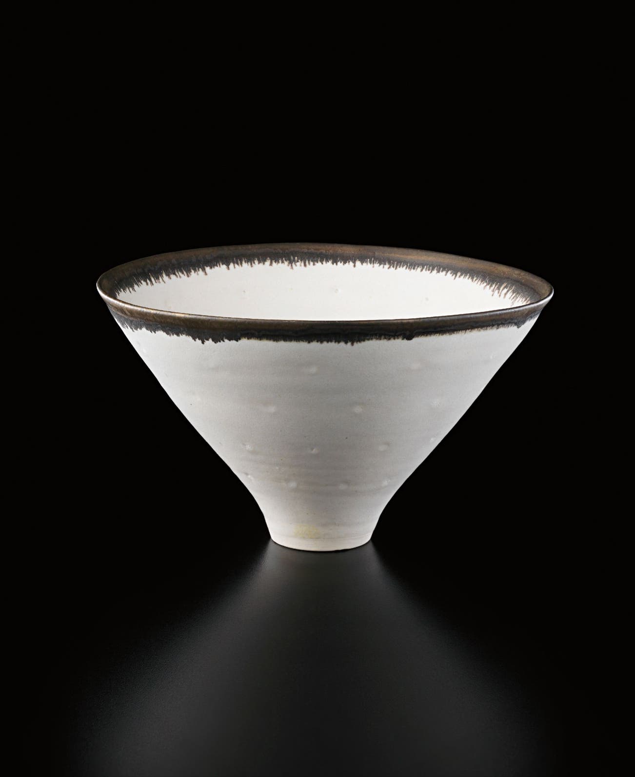 Austrian | B. 1902 D. 1995Dame Lucie Rie studied under Michael Powolny at the Kunstgewerbeschule in Vienna before immigrating to London in 1938. In London she started out making buttons for the fashion industry before producing austere, sparsely decorated tableware that caught the attention of modernist interior decorators. Eventually she hit her stride with the pitch-perfect footed bowls and flared vases for which she is best-known today. She worked in porcelain and stoneware, applying glaze directly to the unfired body and firing only once. She limited decoration to incised lines, subtle spirals and golden manganese lips, allowing the beauty of her thin-walled vessels to shine through. In contrast with the rustic pots of English ceramicist Bernard Leach, who is considered an heir to the Arts and Crafts movement, collectors and scholars revere Rie for creating pottery that was in dialogue with the design and architecture of European Modernism.