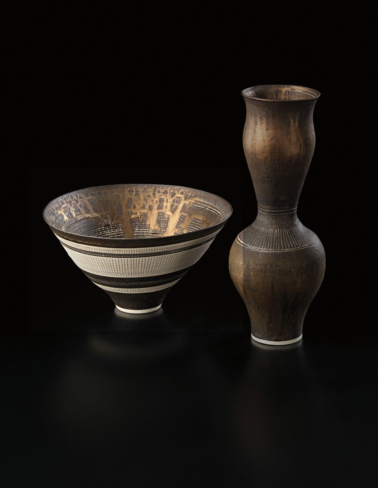 Austrian | B. 1902 D. 1995Dame Lucie Rie studied under Michael Powolny at the Kunstgewerbeschule in Vienna before immigrating to London in 1938. In London she started out making buttons for the fashion industry before producing austere, sparsely decorated tableware that caught the attention of modernist interior decorators. Eventually she hit her stride with the pitch-perfect footed bowls and flared vases for which she is best-known today. She worked in porcelain and stoneware, applying glaze directly to the unfired body and firing only once. She limited decoration to incised lines, subtle spirals and golden manganese lips, allowing the beauty of her thin-walled vessels to shine through. In contrast with the rustic pots of English ceramicist Bernard Leach, who is considered an heir to the Arts and Crafts movement, collectors and scholars revere Rie for creating pottery that was in dialogue with the design and architecture of European Modernism.
