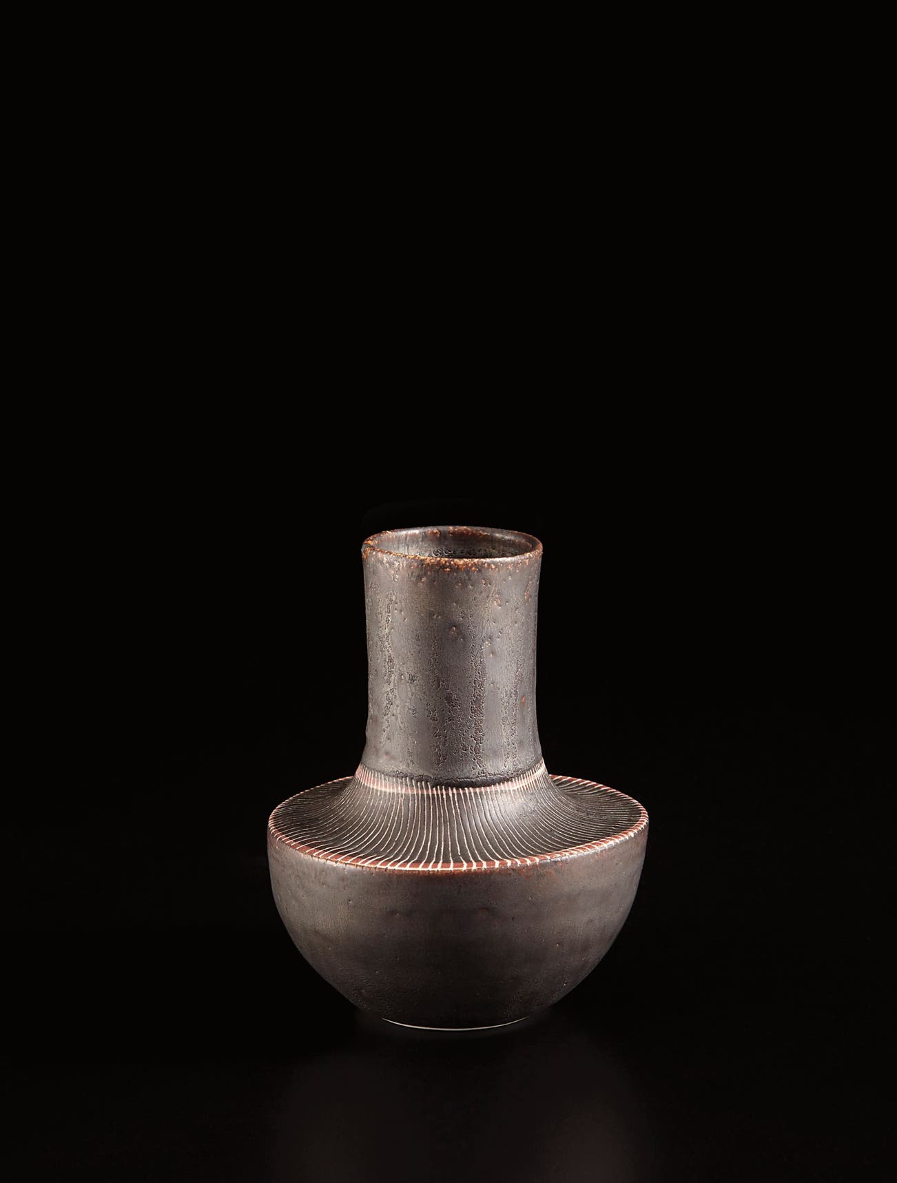Porcelain, manganese glaze with sgraffito design on the shoulder.