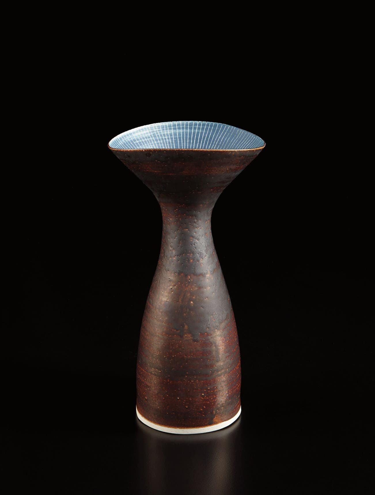 Porcelain, manganese glaze, cobalt blue interior with sgraffito design.