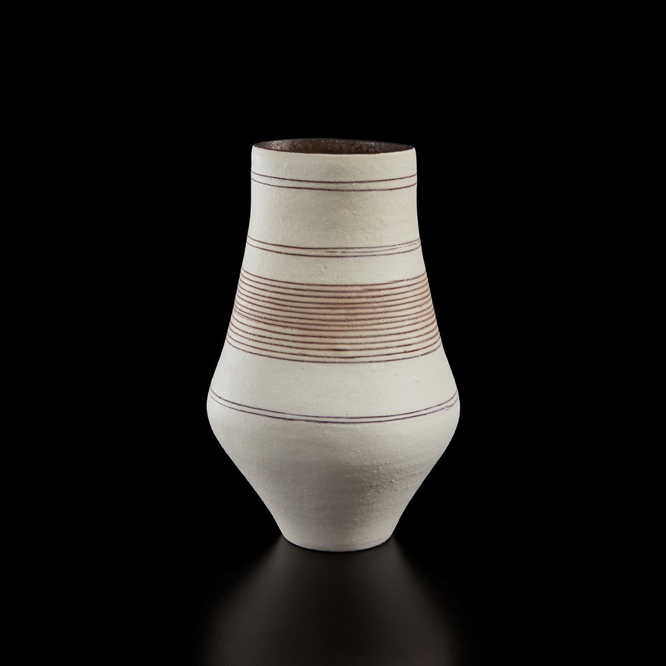 Austrian | B. 1902 D. 1995Dame Lucie Rie studied under Michael Powolny at the Kunstgewerbeschule in Vienna before immigrating to London in 1938. In London she started out making buttons for the fashion industry before producing austere, sparsely decorated tableware that caught the attention of modernist interior decorators. Eventually she hit her stride with the pitch-perfect footed bowls and flared vases for which she is best-known today. She worked in porcelain and stoneware, applying glaze directly to the unfired body and firing only once. She limited decoration to incised lines, subtle spirals and golden manganese lips, allowing the beauty of her thin-walled vessels to shine through. In contrast with the rustic pots of English ceramicist Bernard Leach, who is considered an heir to the Arts and Crafts movement, collectors and scholars revere Rie for creating pottery that was in dialogue with the design and architecture of European Modernism.