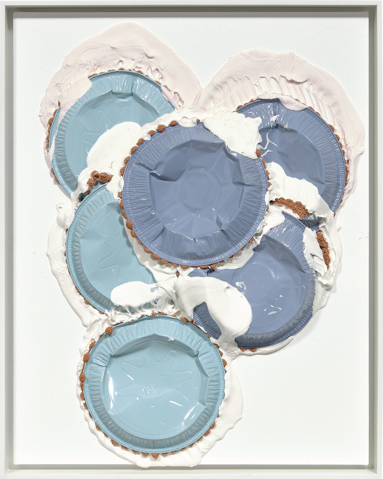 aluminum trays, moulding paste and enamel on gessoed canvas, in artist's frame
