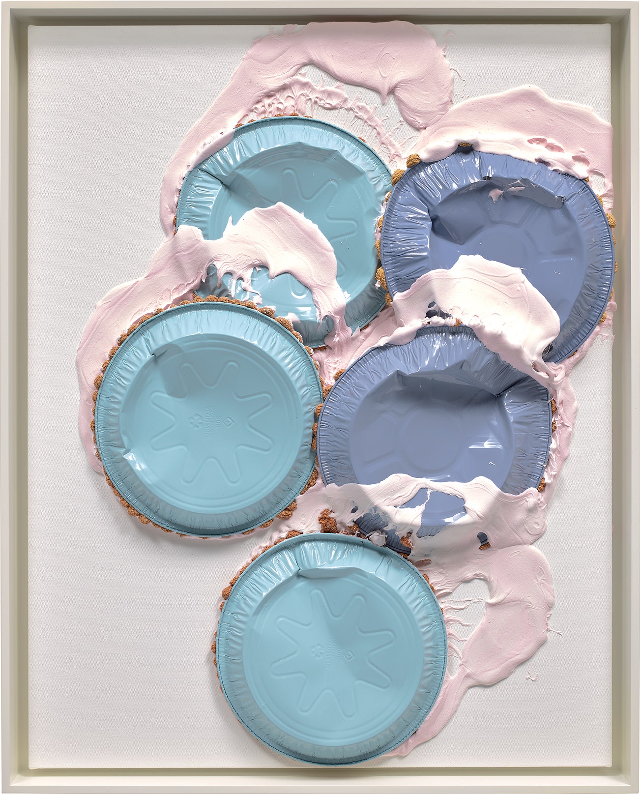 aluminum trays and molding paste on gessoed canvas, mounted to panel, in artist's frame