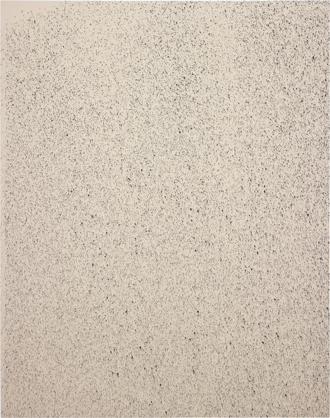 Lucien Smith formulated his Rain Painting series to combine natural beauty with the wild and rhythmic flux of the natural world. A West Coast native based in New York, Smith blends a laid-back mindset with an urban sharpness for artistic execution. His Rain Paintings are created by pelting his canvas from a distance with a standard fire extinguisher filled with a careful formula of acrylic and water. For Smith, “[The Rain Painting] plays into this idea of relationships – relationships between people and relationships between objects... The Rain Paintings in my head serve as backdrops for situations between people and/or objects, very much like backdrops in a play. They become activated when something is placed in front of them; only then do their scale and size come in to effect” (L. Smith, quoted in A. Simpson, ‘Rising Artist Lucien Smith is Making it Rain’, in Bullett, 27 September 2012) As seen in his series of Hundred Acre Wood paintings, in which the A. A. Milne characters have been eradicated from the scene, leaving just the backdrop landscape, Smith’s Rain Paintings again attempt to visually isolate and capture a natural psychological state of earnest nostalgia and isolation. Intimate as a personal experience, yet universal as an experienced sensation, rain is unpredictable and whimsical. Smith’s Double Date, 2011, envelopes the viewer into a dazzling spray of rain drops and a personal moment of self-reflection.