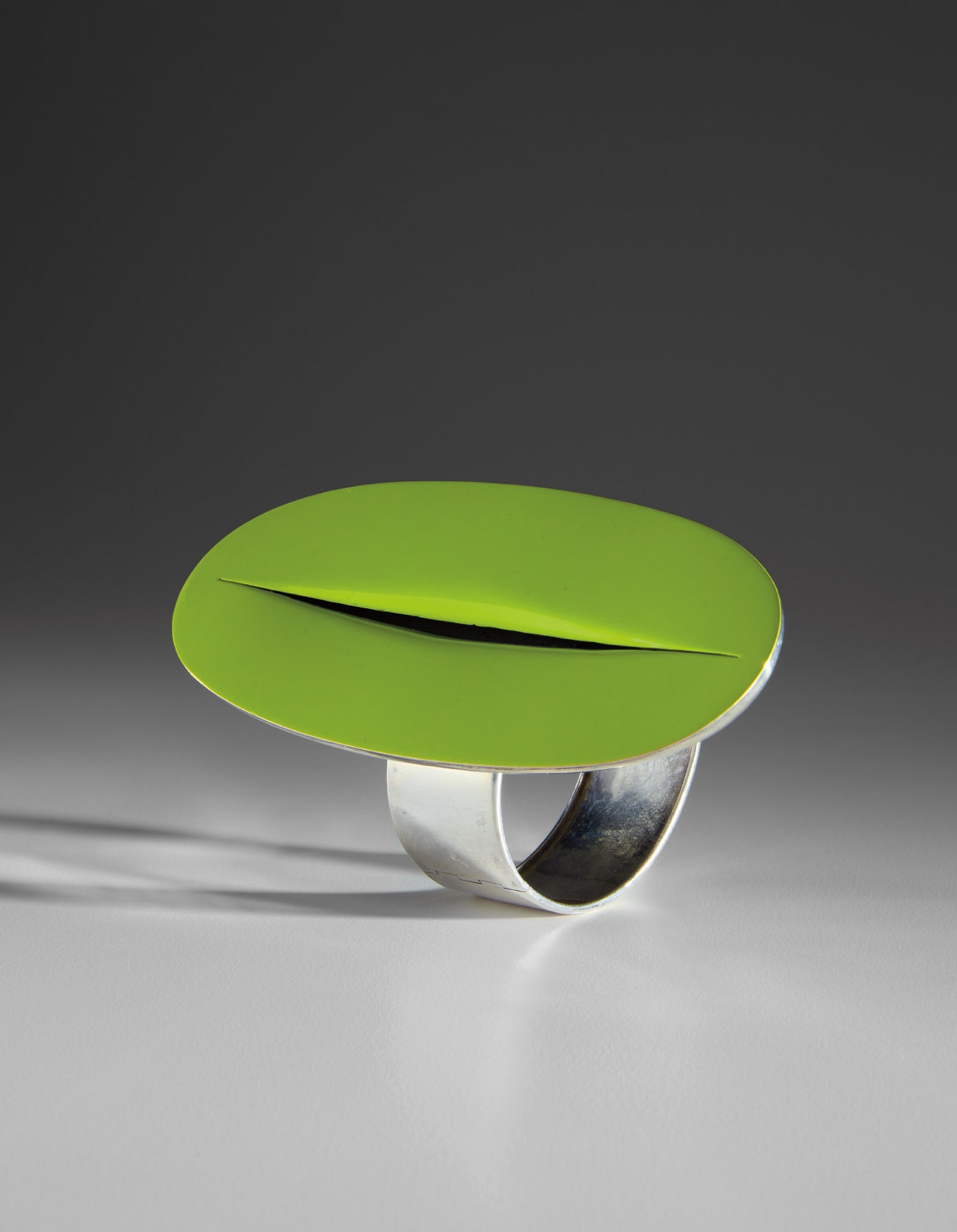 The present "Elisse" cuff bracelet, designed by Lucio Fontana as part of his long-standing and prolific collaboration with GEM, belongs to a second series of jewelry designs the artist created for the company during the 1960s. In keeping with his artistic output, Fontana's jewelry designs are a continuation of his spatial experiments. His silver bracelets from this series present various enamel colors, reminiscent of his iconic study of the "Concetto Spaziale" works on canvas.