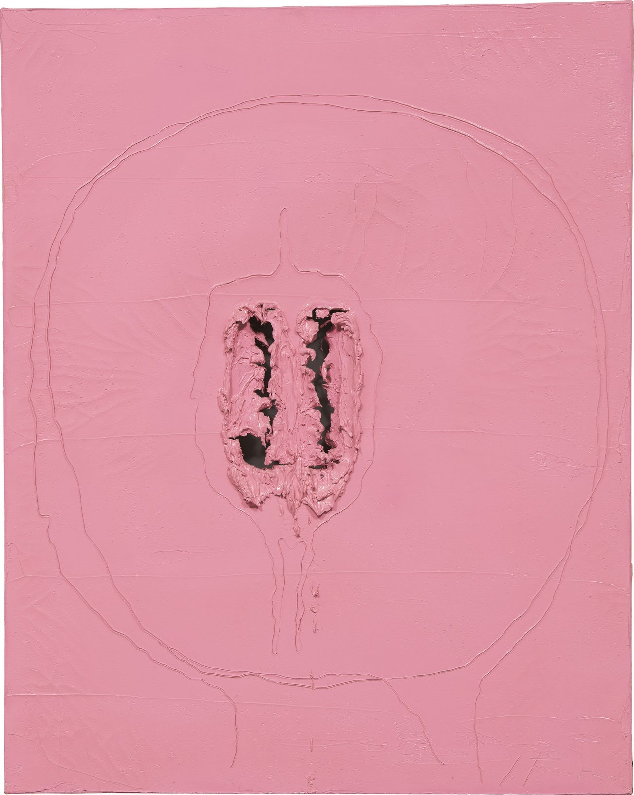 In Concetto spaziale, a textural and vibrant canvas from Lucio Fontana’s olii series, first owned by Teresita, the artist's wife, Fontana re-evaluates traditional means of painting. Representative of his quest for the third dimension, the present work characterises the evolution of Fontana’s dedication to the exploration of outer space. A remarkably textural opus from the apex of Fontana’s oeuvre, the olii series demarcates the introduction of oil into his oeuvre. From the second phase of his olii paintings, Concetto spaziale is one of twelve olii works created in 1968, and is one of only seven executed in an intense shade of pink.