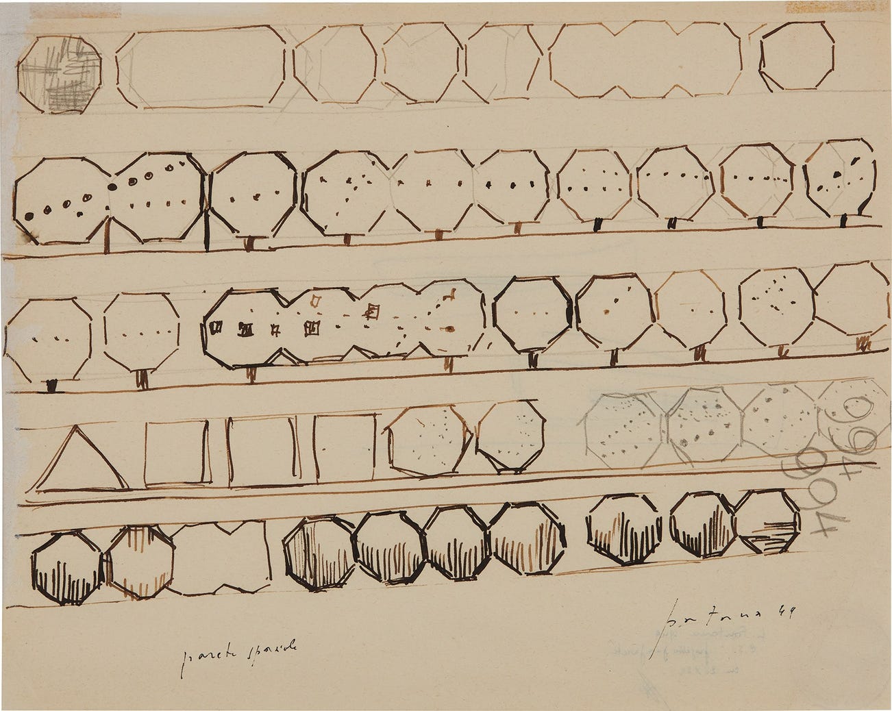 signed and dated 'fontana 49' lower right; further titled 'parete spaziale' lower left