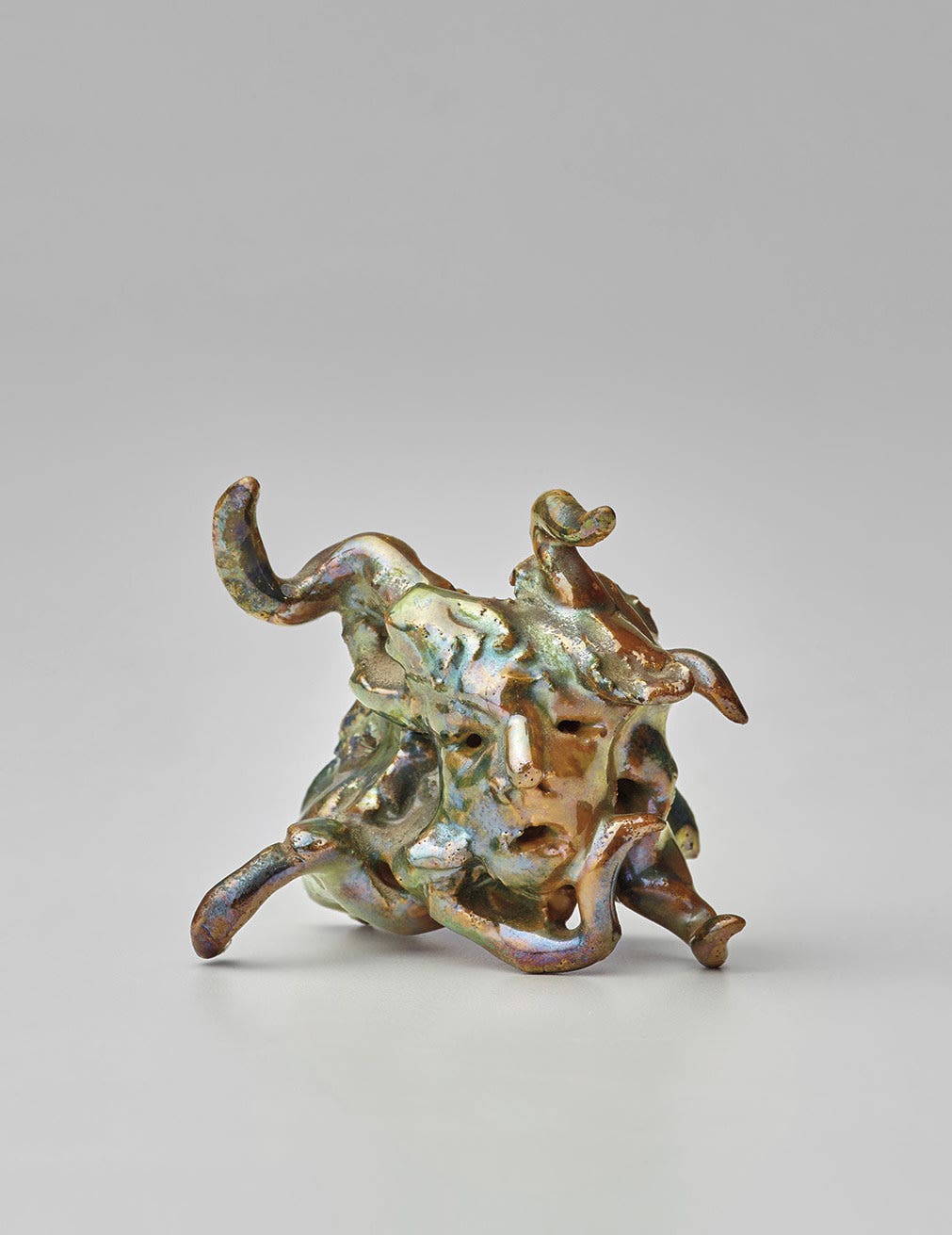 In the 1930s, Fontana travelled to Albissola and the Mazzotti factory, where he started work on his practice, later returning in the 1940s to continue incorporating his Spazialismo ethos within the medium of clay. Having trained in sculpture and ceramics, Fontana had spent his formative years in his father's studio in Rosario de Santa Fe, Argentina, making religious icons for funerals, such as Christ figures and the Virgin and Child. Working with clay provided Fontana with a reactive and flexible medium, malleable properties which bore a symbiosis with Fontana’s Concetto spaziale. Slashing, tearing, rupturing or penetrating his medium with Murano glass, Fontana looked to marry light, sound and form in his holistic works, creating a new visual dialogue with multidimensionality at the forefront of his enquiry. Evident in the neon tendrils of his pinnacle installation Ambiente spaziale a luce nera, 1949, exhibited at the Galleria del Naviglio in Milan, the deep gouges in his monumental terracotta Natura and the opalescent blend of multi-coloured glazes which dance on the surface of his Crocifissione, Fontana’s practice prises open the possibilities of representation. Caught in a fleeting moment between abstraction and figuration, Fontana’s Testa di Medusa showcases the qualities of his chosen medium and celebrates the movement of the clay in its plasticity. Commenting on Fontana’s deft ability to harness the material properties of clay when handling the medium, art critic and friend Guido Balla noted, ‘his hands created an aerial musicality and he remained silent as though in a trance’ (Guido Balla, quoted in, Valérie Da Costa, Lucio Fontana, Deposizione della Croce, Galerie Karsten Greve, Paris, 2017, online).