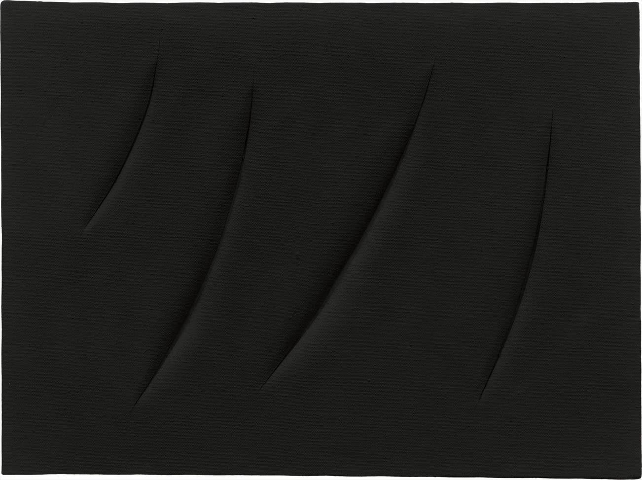 Striking in its meditative stark black pigment, Concetto spaziale, Attese, 1961, reverberates with intuitive poetic gesture; four elegant vertical incisions punctuate the canvas like musical notes ringing through a dark abyss. Literally translated, the title of this piece, like many in this series, means Spatial concept, and the word Attese means to wait or to expect. Rarely wasting a canvas, the artist would spend much of this time contemplating and waiting until a moment of inspiration overcame him. He would then approach the painted canvas with his blade, creating concise slashes or tagli. Puncturing the once tense surface of the canvas, it delicately folds back inviting the viewer’s gaze to reach beyond the plane, to penetrate and contemplate the infinite expanse. In order to achieve this illusion, the artist would often line the reverse of the canvas with black linen; resulting in the appearance of black space beyond the slashes, furthering the perception of depth. Fontana’s choice of color in this work evokes the boundless quality of interplanetary space, and beyond that, noted by the breaking of the surface, suggests a collapse in temporality. indeed, the present