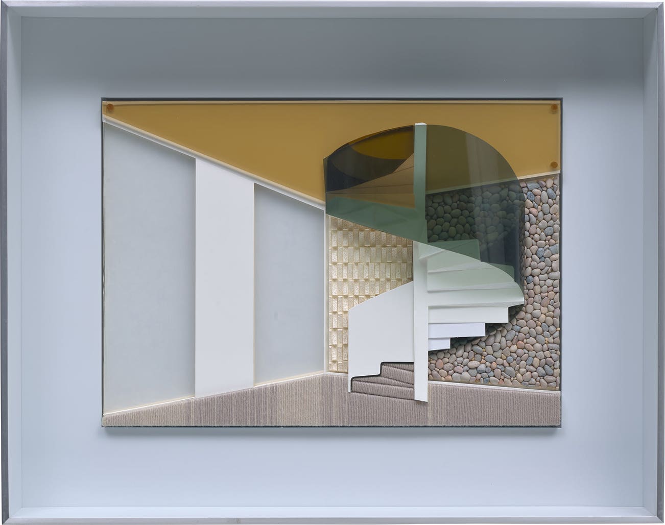stone, foam, yarn, plastic and cardboard, in artist's frame