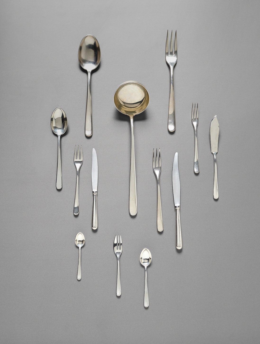Executed by silversmith Luciano Canton, Milan, Italy. Each marked with 925 purity mark, 674/MI maker's mark and Milan city mark. Comprising 12 table forks, 12 fish forks, 12 dessert forks, 12 pastry forks, 12 table knives, 12 fish knives, 12 dessert knives, 12 table spoons, 12 dessert spoons, 12 tea spoons, 1 ladle, 1 serving fork, 1 serving spoon.