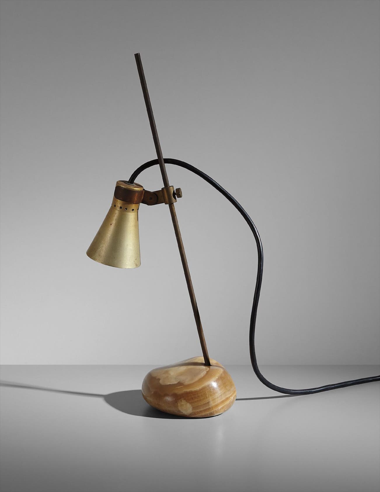 Brass, anodized aluminum, polished river stone.