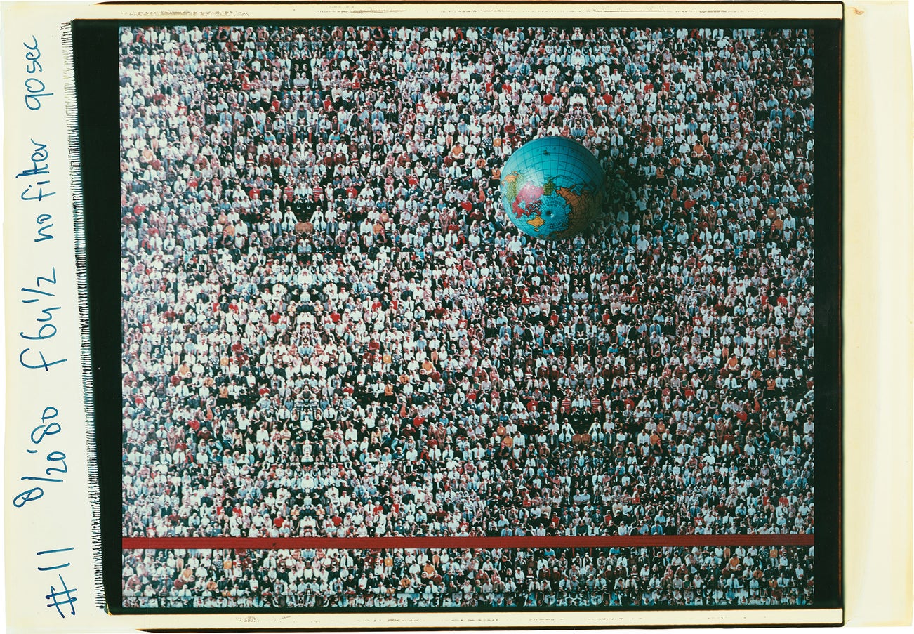 In 1980 and 1981, Luigi Ghirri (1943-1992) was invited by Polaroid International, along with seven other photographers, to use the recently acquired 20x24 camera in their Amsterdam studio. While many props were made available, which the other participants used to create their Polaroids, Ghirri chose to bring suitcases filled with his own found objects. The resulting image offered here – a complex composition of a crowd (mirrored and replicated multiple times to increase its expanse) superimposed with a ‘floating’ globe as a visual anchor – best represents Ghirri’s ability to create pictorial adventures for the eyes and the mind.
