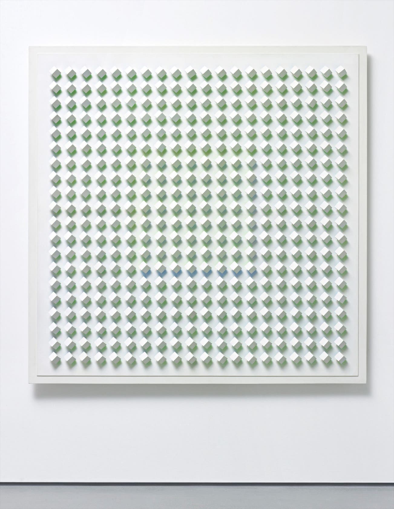 Atmosphére chromoplastique No. 248 (1970) consists of four hundred cubes laid uniformly upon a wood en surface, creating a grid with equally proportioned spaces between forms. The underside of each cubic unit is painted on two surfaces with fluorescent green or electric blue , creating a subtle glow throughout the work. The present lot epitomizes Tomasello’s oeuvre in its expolartion of the interplay of color and light that occurs where the cubes meet the work’s surface and where the veiwer’s eye engages with the materials. Atmosphére chromoplastique No. 248 is a large scale example of Tomasello’s mastery of the dialogue between the geometric and kinetic forces on hand in his own work and in modern art at large.