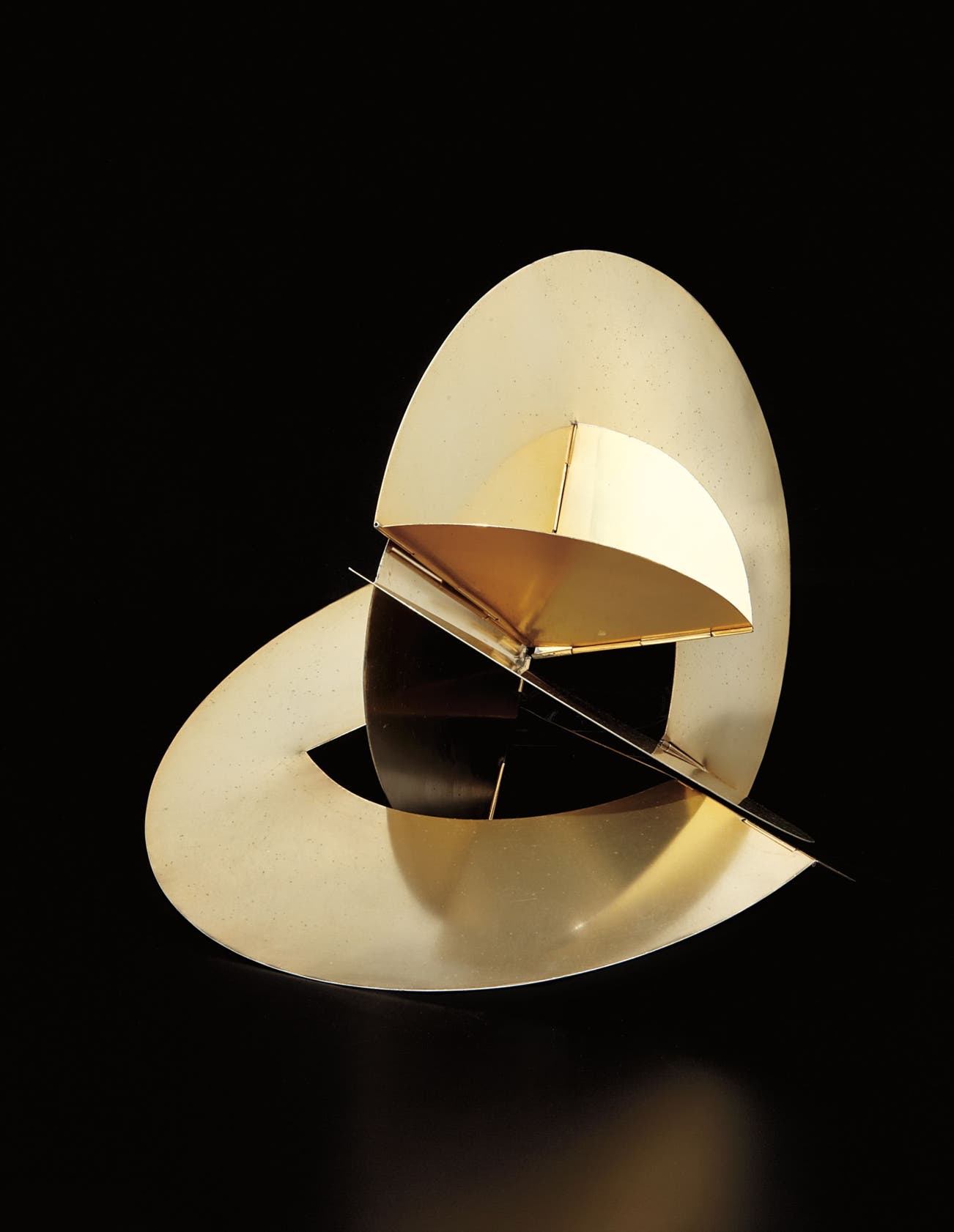 The individual Bichos were often given their own subtitles, such as in the present lot Bicho parafuso sem fim (Endless Thread) which, one can only assume, emerged from the specific characteristics of the movement this particular “specimen” allows. Bicho parafuso sem fim is, in fact, unusual. Given its early date, 1960, it belongs to the very first examples of Bichos. Its anodized golden color sets it apart from the majority of other works in the series, and another of its most prominent characteristics is the presence of articulated panels within panels. Art historians may speculate here whether these cut-out elements might provide a means of comparison between Clark’s early Bichos and the sculptural work of her fellow Neo-Concrete colleagues, Franz Weissmann and Amílcar de Castro, whose work explored the formal and spatial possibilities of the fold and the cut.