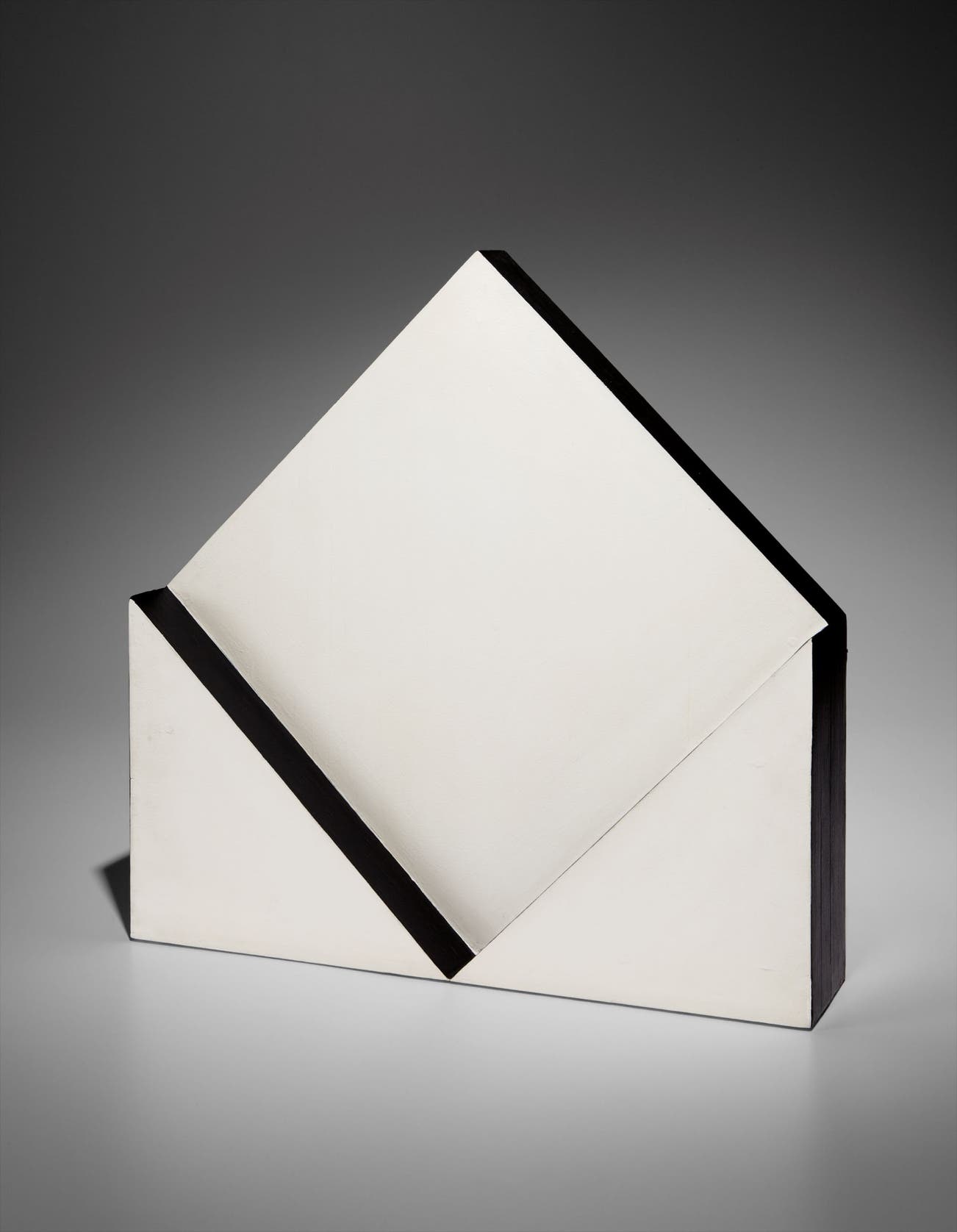 One of the principle precepts of neoconcretism, as argued by the group’s spokesman Ferreira Gullar in his Theory of the Non-Object (1959), was the ambivalence in relation to traditional disciplines or categorisations of art works. For Gullar, with neoconcrete art, the domains of painting and sculpture converged. In Pape’s Sculpture, had it not been for the work’s title, it would indeed be difficult to determine whether this is a painting, a relief or – and why not? – a sculpture. Such indeterminacy was articulated by Gullar in his neoconcrete critique, drawing on phenomenology and in anticipation to minimalism, with regard to the relation that a work possesses with its surrounding space and how that affects the viewer. Indeed, the different planes in Pape’s Sculpture, the conjunction of its geometrical configuration and the white surfaces intersected by black perpendicular planes, proposes distinct visual experiences according to the position of the viewer vis-à-vis his/her position in the gallery space. Such a phenomenological emphasis involves time: the time in which one perceives the object in space, the time necessary for the viewer’s dislocation around the art object. Time had been one of Pape’s themes in her ‘Book of Creation’ (1959) and in her Book of Time (1961-63). The individual ‘pages’ of the latter, all based on square configurations, do indeed possess strong affinities with the work presented here which consists of intersecting one square with another (half)square placed at 45° and on another plane as if having been opened up, revealing its inner or lower layer.