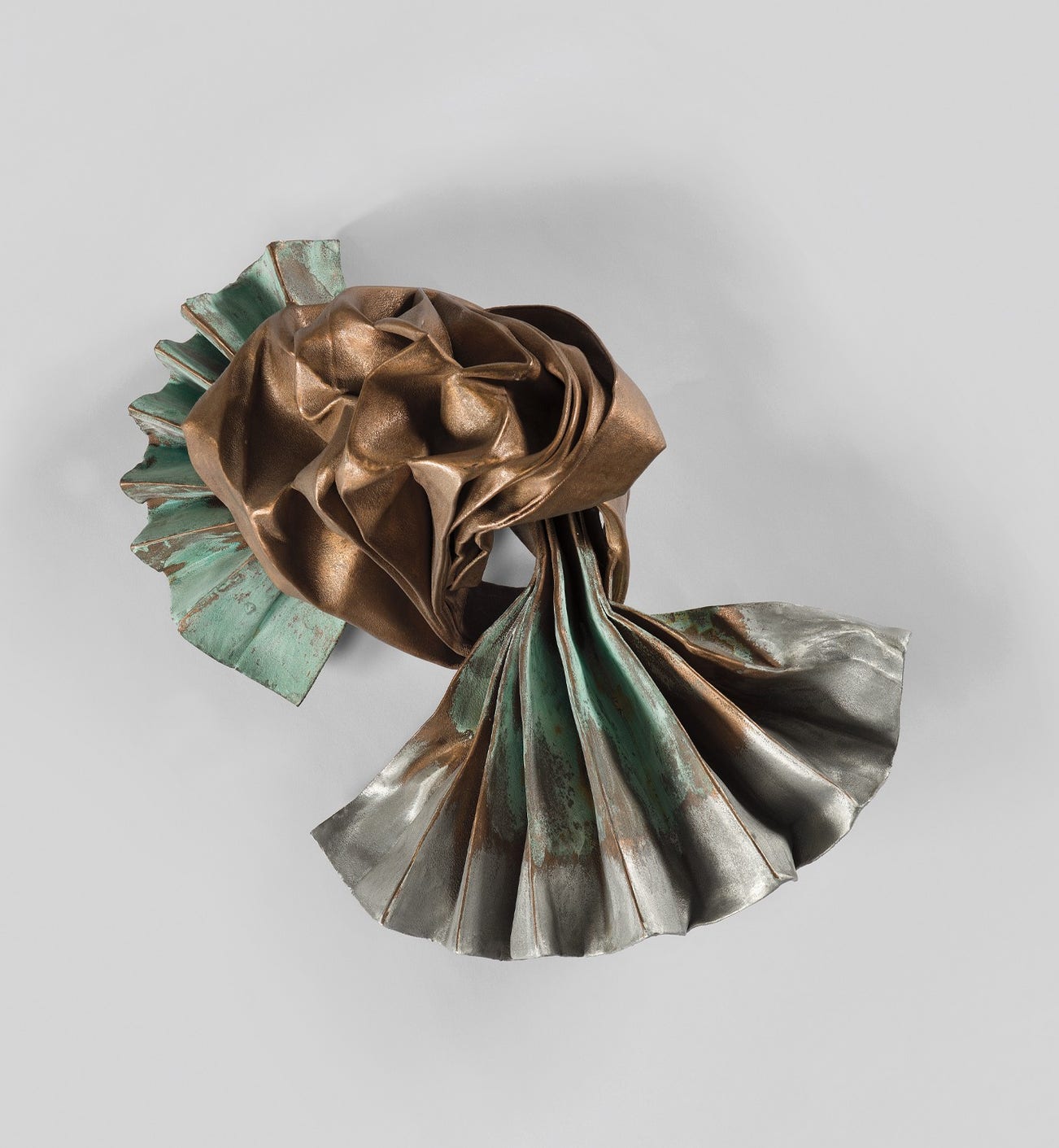 bronze wire mesh, sprayed zinc, aluminum and copper with green patina