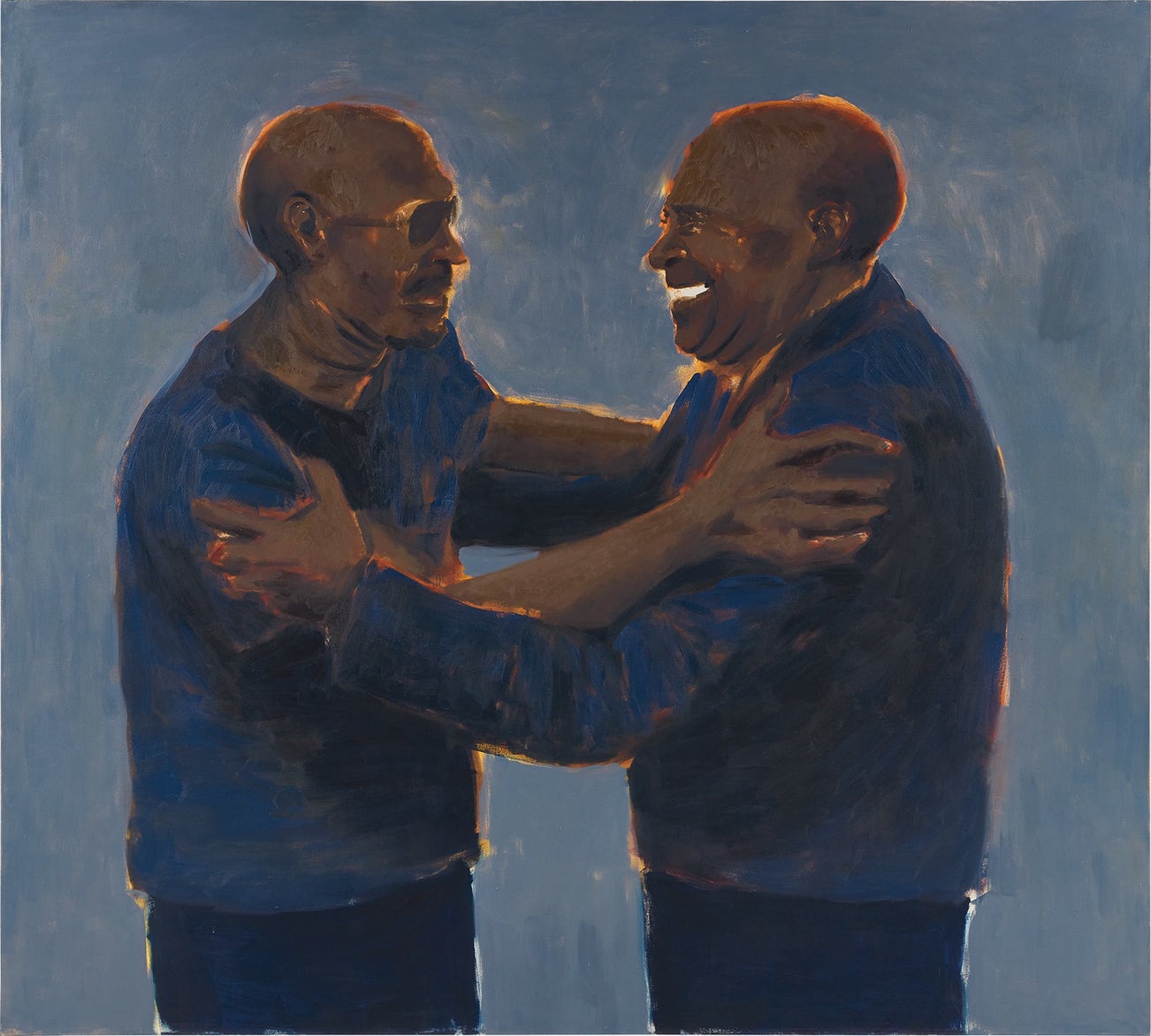 Rendered with her typical spontaneity and elegance, The Ingenuity captures the fleeting, quotidian moment of embrace between two figures, in the briefest glimpse of a moment that exists outside of time or place. The loose, expressive brushstrokes and deftly painted fields of muted but nonetheless opulent colour evoke a sense of transience; Yiadom-Boakye works quickly, infamously completing the majority of her works in a single day, preferring to improvise with the malleability of fresh oil paint. Similarly, Walter Sickert – whose work, Yiadom-Boakye has acknowledged provided elements of inspiration for her own artistic practice – had a gift for painting swiftly on a wet canvas. Like the two men depicted in The Ingenuity, the subject of Sickert’s painting Sir Thomas Beecham Conducting, circa 1935 is situated against a monochrome background, dislocating him from a specific setting and allowing his gesture and countenance to command the viewer’s full attention. Yiadom-Boakye’s technique results in a distinctive sense of creative energy and painterly immediacy, successfully capturing the specific mood of a precise, transient moment in time, evocative of Picasso's Blue Period portraits, such as Two Sisters, 1902. One can also compare her work with that of Lucian Freud, whose mastery of tone and depth to imbue vibrancy in flesh is also evident in the striking flecks of white-orange heat which provide a translucent sense of movement. Her sumptuous palette and namely her refusal to use black pigment, which can flatten and negate three-dimensionality, creates an extraordinary sense of depth in The Ingenuity, which dislocates the mise-en-scène from a specific location or particular historical time-frame. Instead, the viewer is encouraged to construct their own background to the characters she creates. As Zadie Smith muses, ‘Yiadom-Boakye has inherited a narrative compulsion, which has less to do with capturing the real than with provoking, in her audience, a desire to impose a story upon an image. Central to this novelistic practice is learning about how to leave sufficient space, so as to give your audience room to elaborate’ (Zadie Smith, ‘Lynette Yiadom-Boakye’s Imaginary Portraits’, The New Yorker, 19 June 2017, online). Writing poetry alongside her visual work, the artist draws upon language to fully envisage the subjects of her studies as opposed to working from life. In this sense, her characters embody the same ephemeral, fictional quality as literary characters; just enough material is given to prompt us, to spark our interest, and the rest we are allowed to devise ourselves. This is developed in her use of intriguing, elusive titles – in this instance, The Ingenuity leaves us wondering whether we are viewing a moment of triumph, genius or congratulations. As Zadie Smith goes on to say, ‘her titles run parallel to the images … the canvas is the text’ (Lynette Yiadom-Boakye, quoted in Zadie Smith, ‘Lynette Yiadom-Boakye’s Imaginary Portraits’, The New Yorker, 19 June 2017, online).